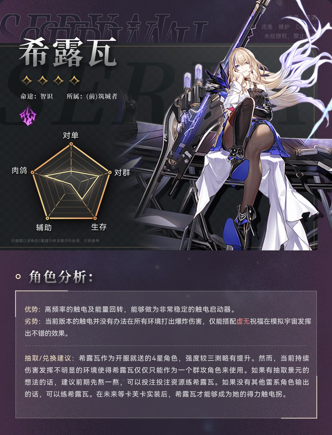 作为预约奖励和开服就送的角色,希露瓦是雷属性智识角色,具备当前版本中最稳定的触电触发能力。在模拟宇宙中,她可以利用虚无的祝福打出不错的持续伤害。在其他场合,希露瓦可以用作群攻角色,也可以在对付雷弱点时发挥作用。如果你不打算在本版本下半部分的卡池中抽取景元,并且对另一位四星雷属性角色阿兰不感兴趣,那么你可以选择先练起希露瓦,然后等待她的队友卡芙卡。总的来说,光锥强烈推荐你在游戏中使用希露瓦。