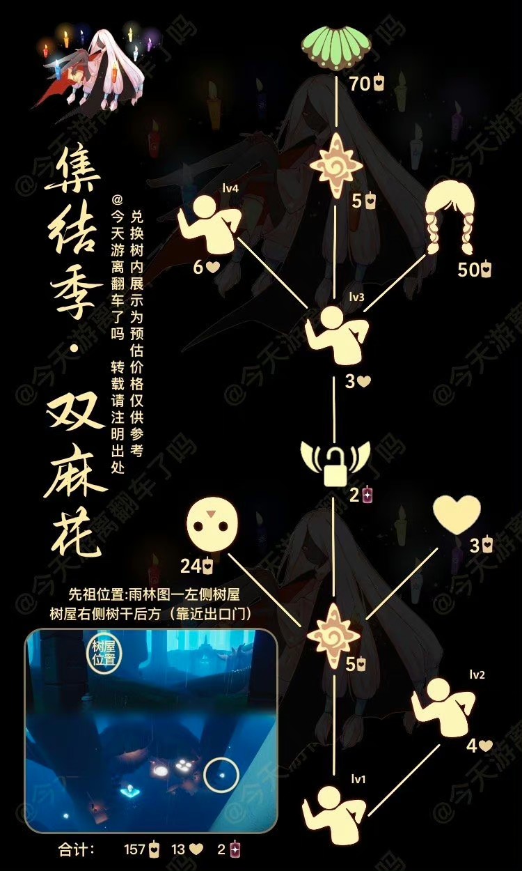 五一加塞复刻!集结季绿丝带! 绿丝带第一次复刻哦,想换的抓紧时间跑图啦! 𝗣𝟭 预估兑换树,仅供参考 𝗣𝟮 动作展示 注:现在就可去收集先祖,但需要周六早上6点后才可换取物品 注2:之前已收集过的先祖就无需重复收集 注3:加塞复刻先祖到访时间:周六早6:00-周三中午12:00 图文/今天游离翻车了吗 #光遇复刻# #光遇帮帮团#