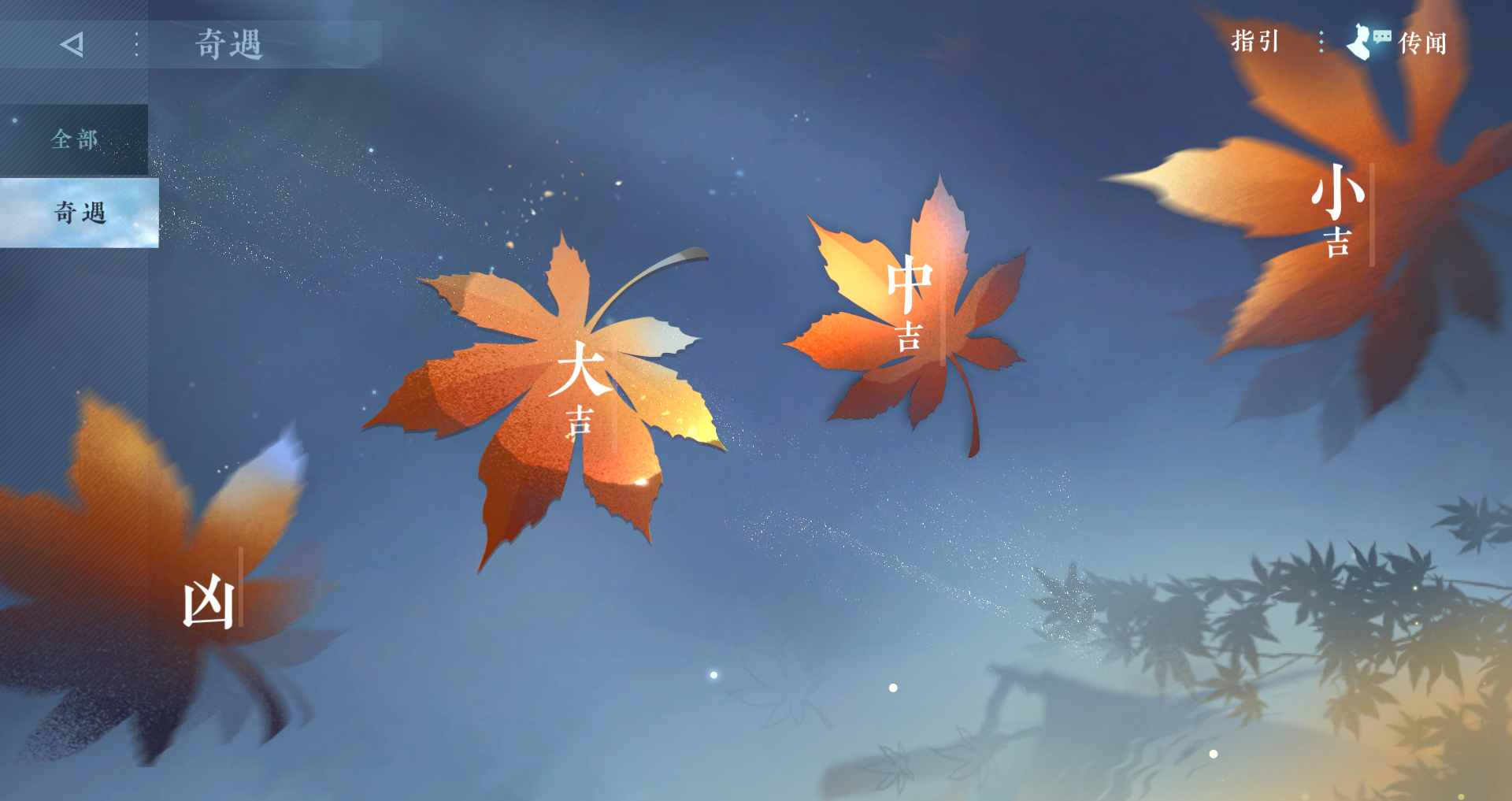 奇遇系统是手游提供的一个系统,它可以通过点击游戏界面右上角的【菜单】-【开放世界】-【奇遇】页签来打开。手游奇遇系统共分为大吉、中吉、小吉、凶四类,但目前凶并没有开放。
