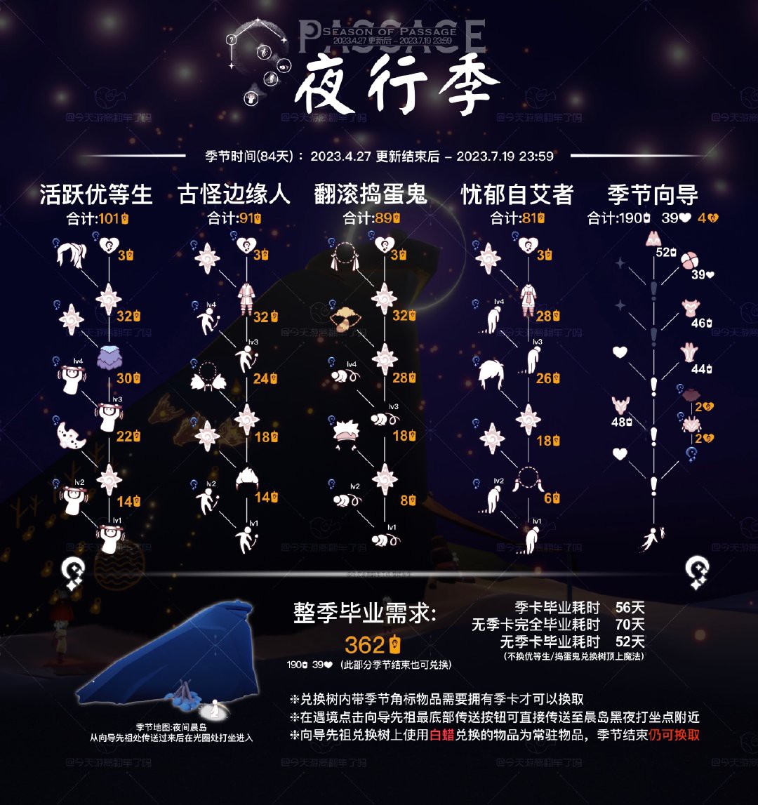 【夜行季】相关攻略#光遇夜行季# 𝗣𝟭季节兑换树,季节结束时间将在季节开始后补充 𝗣𝟮季节地图进入方式 𝗣𝟯季节先祖位置 𝗣𝟰季节任务一流程图解 𝗣𝟱季节任务二流程图解 𝗣𝟲季节任务三流程图解 𝗣𝟳季节任务四流程图解 本季无新增光之翼 【转载出处】今天游离翻车了吗
