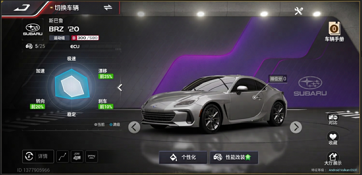车辆前瞻|斯巴鲁BRZ,为新手量身打造的驾驶启蒙车 车手们好呀,《巅峰极速》即将在6月20日正式公测上线了。>>点击预约[https://cloudgame.webapp.163.com/reservation/?id=6407265b058b3c42d6fda554] 在正式上线以前,云云将为车手们带来各种车辆前瞻爆料~今天我们车辆大爆料环节为大家带来的是「斯巴鲁BRZ」。#巅峰极速#  一、基础属性 基础属性方面,BRZ属于运动组,这部经典之作以低重心、轻盈灵活为特色,较高的操控精准度让它很适合被用来磨练赛道技术。它的转向、漂移和刹车三大属性比较突出,「加速」和「稳定」能力也比较均衡,属于综合型赛车。 此外,BRZ在改装度为零时,0-100千米/时的「加速时间」为6.0S,满级改装时则为4.4S。实测零改装度「最高速度」为202千米/时,在运动组的表现不错,能与传说级车辆一较高下。 二、车辆特性 BRZ的前段加速处于中上水准,但时速到达120千米/时后的中后段加速比较优秀,极速也比较高。上手后建议关闭驾驶辅助,能更好地发挥车辆优势。 操控方面,BRZ的驱动方式为「前置后驱」,在手感上是更适合漂移跑法。由于车身重量大,漂移性能较好,漂移过弯操作起来手感丝滑的同时,具有较高的稳定性,在运动组里独树一帜。 三、适合赛道 作为综合型赛车,BRZ更适合「芝加哥-半程」、「芝加哥-内环枢纽」这类直道和弯道分布均衡的赛道,能最大限度地发挥车辆优势,取得更佳的成绩。 此外,由于车辆稳定性比较高,也适合一些路肩比较多、地面不平的赛道,类似于「旧金山-观光环道」、「旧金山-金门回溯」等。当其他赛车因为路肩而颠簸,影响驾驶体验和赛道成绩时,BRZ带来的出色体验会让人感到惊喜。 四、改装推荐 由于BRZ是稀有级别的车辆,改装不会消耗过多资源,因此性价比较高。改装的总体方向,推荐引擎-冲刺调校、轮胎-中性胎、电控-保守倾向、底盘-街道型、车身-高重心设定。 还因为车辆的特点突出,所以在前期资源不够时,只需要针对其特长进行强化,无需耗费过多资源追求面面俱到。 好啦,以上就是本期BRZ车辆的简析,相信你一定对BRZ这款车有了一个比较全面的了解了。可以看到BRZ性能强劲、改装性价比高,可以说是为新手量身打造的驾驶启蒙车。车手们有没有想立刻坐上这款车的冲动呢?6月20日TA在《巅峰极速》中等着各位车手哦~