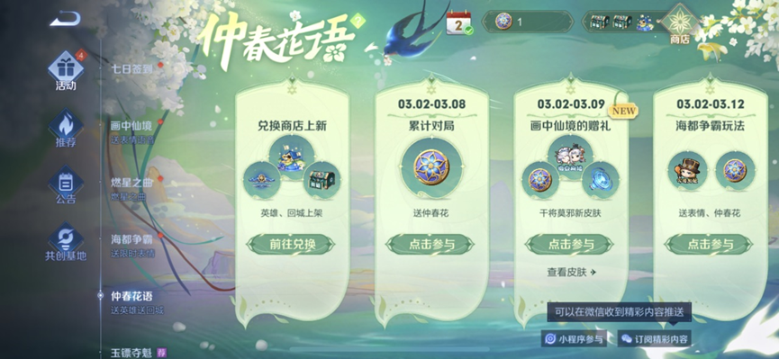 【仲春花语】送英雄送回城活动开启公告 1、活动时间:3月2日-4月3日 2、活动规则 1)活动期间,玩家可通过各个页签了解活动期间重点活动的时间和奖励; 2)玩家可通过活动内置顶页签了解兑换商店上新奖励并前往商店进行兑换; 3)玩家可点击【观看视频>】前往微社区查看皮肤/英雄/玩法相关视频; 4)玩家可点击【查看皮肤>】或【查看英雄>】前往商城查看皮肤、英雄详情; 5)活动期间开启的活动会产出一定数量的仲春花。兑换商店开启期间,玩家可使用获得的仲春花进行奖励兑换。具体可获得的仲春花数量及概率详情见对应活动的规则页面; 6)玩家可在兑换商店使用钻石兑换仲春花,活动期间限兑十次; 7)微信区的玩家点击【订阅精彩内容】可在微信收到精彩内容推送; 8)玩家可点击右下角【小程序参与】前往王者营地小程序参与相关活动; 9)在活动期间进行转区的玩家可能会出现活动异常的情况,请召唤师们在活动期间谨慎转区,转区导致的异常将无法处理; 10)具体活动详情及参与方式可查阅官网公告和游戏内活动规则。 #云手机分享#