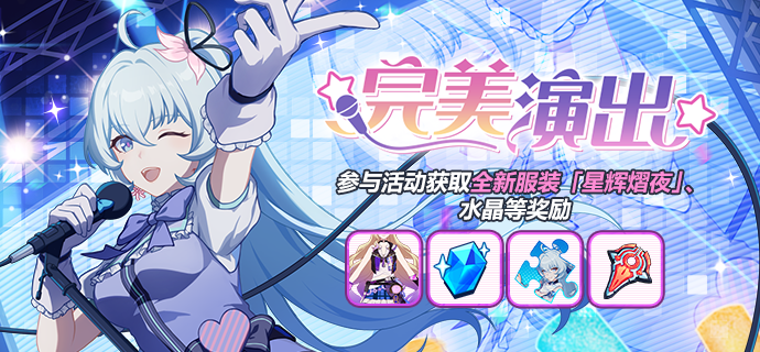 #崩坏3#【公告】☆完美演出☆ | 参与获取女武神·荣光全新服装 “呼——今天是个好天气呢!” “阳光明媚,空气清新,连街上都是……” “我的海报?” “什么?原来我有一场演唱会要举行吗?” 「☆完美演出☆」活动即将开启,时雨绮罗正在筹备一场演唱会。她需要舰长的帮助,舰长参与活动可帮助时雨绮罗提升演唱会筹备进度,并解锁多位可招募应援成员。此外,舰长参与活动还可获取水晶、「糖露星霜碎片」、女武神·荣光全新服装「星辉熠夜」等奖励。 =====☆完美演出☆===== 【活动时间】6.7版本更新后~7月6日04:00 【活动等级】30级及以上 【活动内容】 1)本次活动「☆星光演唱会☆」中的剧情内容,及「☆演出宣传☆」中的活动关卡将分为三个阶段依次释出,具体开放时间如下: 「潮流都市」区域:6.7版本更新后; 「不夜城」区域:6月5日10:00; 「星光舞台」区域:6月9日10:00; 「☆演出宣传☆」活动关卡存在额外解锁条件:舰长只有在收集对应区域内所有的「☆星光应援棒☆」后,方可前往下一区域参与「星启巡演」与「星动舞台」。 2)舰长每天将可获取2份「☆星光演唱会预告册☆」,使用该道具即可参与到「星启巡演」之中。通关「星启巡演」后,舰长将获得「☆星光应援棒☆」。 3)舰长使用「☆星光应援棒☆」后可提升舞台筹备进度。随着舞台筹备进度提升,舰长在活动内的角色也将获取战斗增益,同时提升攻击力与全伤害。 4)舞台筹备进度达到对应值时,将解锁可招募的应援成员。应援成员共计六位,每位应援成员的应援才能不同,成功解锁应援成员后,舰长将在活动中获取战斗增益加成。 5)招募应援成员前需完成来自应援成员的试炼,六位应援成员的试炼均不相同。成功招募应援成员后,舰长还将获取额外的星石奖励。 6)「☆演出宣传☆」玩法中的三个区域分别拥有不同的关卡技能。舰长可在出击准备界面进行查看。「☆演出宣传☆」中的「星动舞台」关卡拥有排名机制,将记录舰长所获取的关卡最高得分。 =====☆星光周边站☆===== 「星际偶像」绮罗星限定周边产品火热贩售中,另有「全能偶像」识女士周边免费附赠!——喂,这是谁写的宣传词! 【开放时间】6.7版本更新后~7月13日04:00 【开放等级】30级及以上 【活动内容】 舰长参与「☆完美演出☆」活动获得的「☆璀璨的绮罗星☆」,可用于在活动商店「☆星光周边站☆」中兑换水晶、「糖露星霜碎片」、女武神·荣光全新服装「星辉熠夜」等奖励! *爱酱小贴士: 1)在本次活动中可获得的「☆璀璨的绮罗星☆」数量足够兑换完「☆星光周边站☆」活动商店中的所有奖励~ 2)6月29日04:00~7月6日04:00期间,「☆星光周边站☆」中将开放水晶购买「☆星光演唱会预告册☆」,价格为70水晶/1个「☆星光演唱会预告册☆」。 3)7月6日04:00~7月13日04:00期间,「☆星光周边站☆」中将开放水晶购买「☆璀璨的绮罗星☆」,价格为10水晶/15个「☆璀璨的绮罗星☆」。 4)7月6日04:00后,「☆星光演唱会预告册☆」将由系统回收。 5)7月13日04:00后,「☆璀璨的绮罗星☆」将由系统回收,回收价格为500金币/1个「☆璀璨的绮罗星☆」。