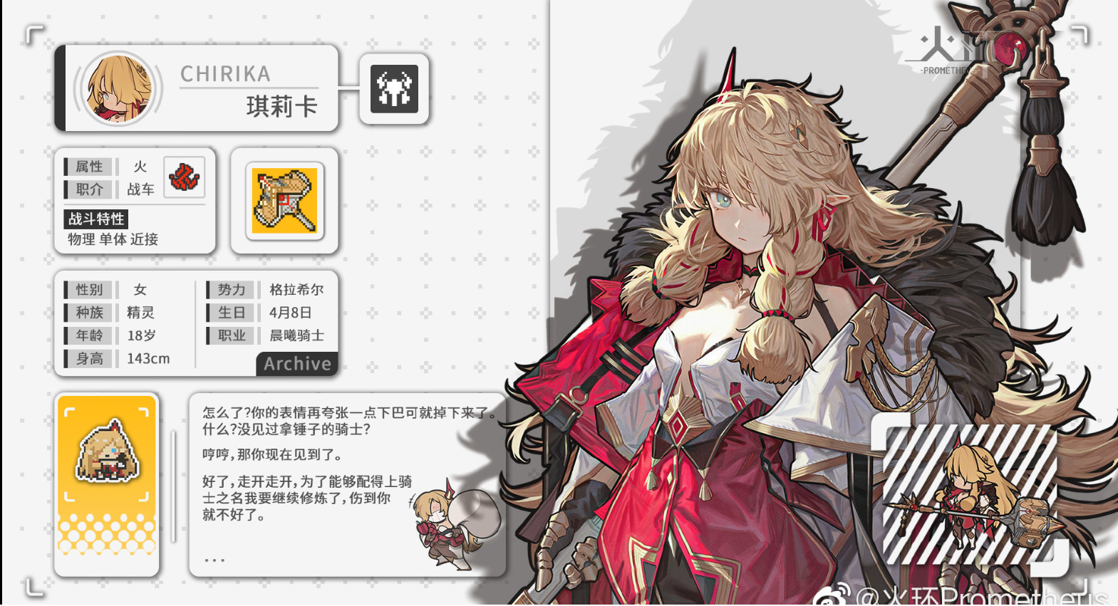 晨曦骑士琪莉卡是一个元气满满的暴力选手,看似娇小的身体里隐藏着超乎常人的怪力,喜欢别人夸奖自己,但是被夸奖后却又不能率直的接受,而是会用一种稍显傲慢的态度去回应。 在战斗中,琪莉卡活脱脱像一个莽夫,凭借着大锤带来的重量优势,经常能在战场上为团队打开一道缺口,但这莽撞的战斗方法也使得琪莉卡经常陷入危险的境地,只是不服输的她,即使面对强大的敌人也不会选择撤退,无论被击倒几次都会挣扎着重新站起来,并用她一直以来的方法从困境中打出一条道路。 不管是在战场上还是日常生活中,她总是表现出一副气势汹汹的态度,只有在珀里亚丝面前才会有些收敛。 【愿晨曦的光芒可以永远照耀...诶...呃...后面是什么来着...完了,这下又要被珀里亚丝姐姐念叨了。】 #火环#