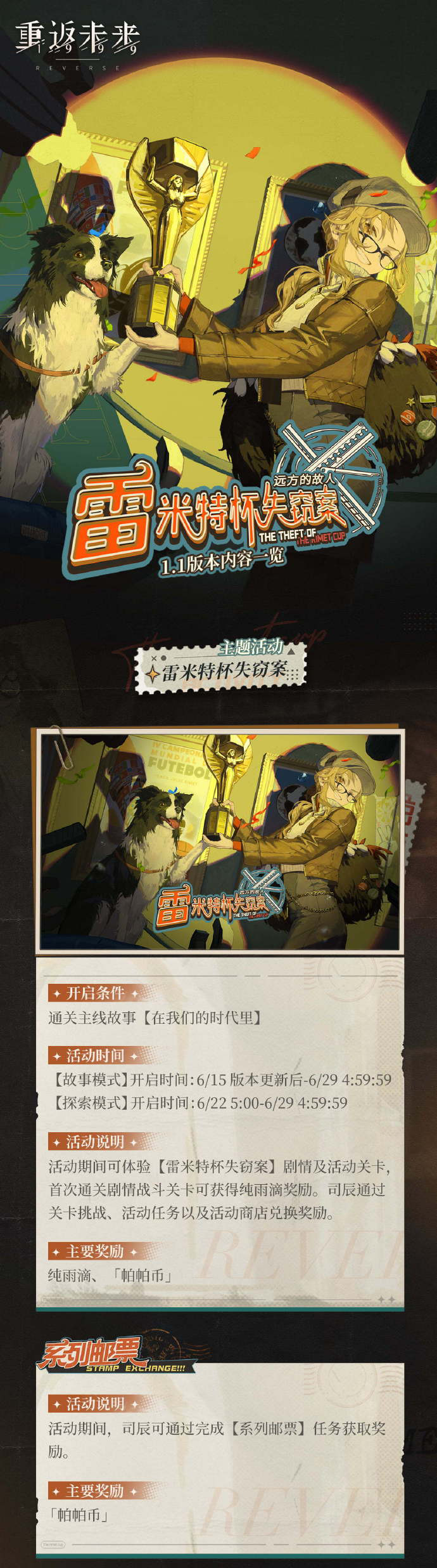 #重返未来:1999#》1.1版本「雷米特杯失窃案」将于6月15日正式开启!敬请查看版本内容一览。 ▶▶1.1版本内容一览◀◀ ※全新主题活动「雷米特杯失窃案」开启 ※神秘新秀【梅兰妮】【皮克勒斯】【挖掘艺术】登场 ※角色剧情活动【梅兰妮·以盗制盗】【皮克勒斯·小狗与流浪汉】开启 ※限时季度挑战【UTTU闪烁集会·昨日金杯】开启 ※活动【怪盗的题集】【皮氏的意译】开启 ※【流行即世界】【牧羊犬如是说】活动征集开启 ※【绿茵的盛典】系列衣着,限时上架 ※全新荒原主题套装【雾的故乡】,限时上架