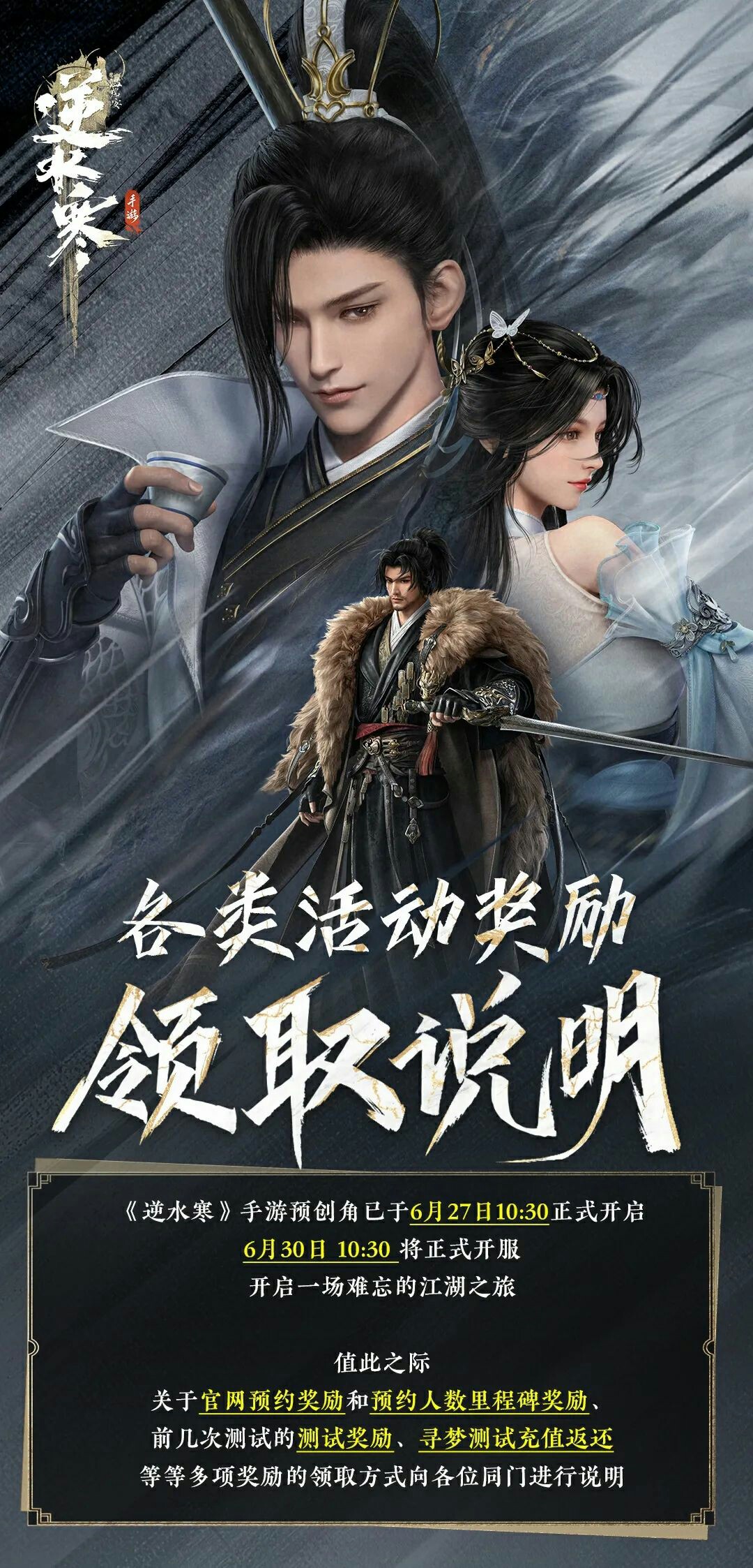 #逆水寒手游# 各种活动奖励领取说明 马上就要开服了,各类公测前的活动奖励,公测后要如何领取呢?小寒用一张图跟大家讲个明白! (没有参与这些活动的玩家也不用担心,游戏开服后也有丰厚的活动和奖励!) 所有江湖偶遇,都是宿命相逢。 6月30日10:30,一起拥抱MMO开放世界游戏的崭新时代。 会呼吸的江湖里见!