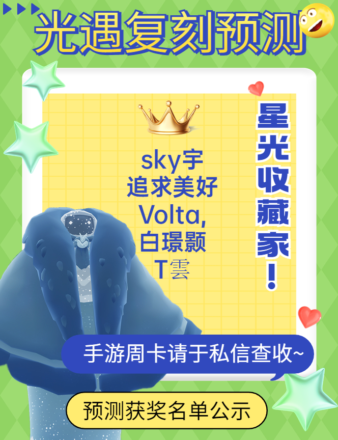 #光遇复刻#|预测公示:星光收藏家! 👑上一轮的复刻预测你答对了吗~ 👑恭喜图上的友友凭借超神预测被云云抽中获得手游周卡~ ⚡【活动奖励】手游周卡兑换码请于私信处查收~ ⚡【活动预告】下一轮旅行先祖到临前一周还会再次开启预测活动噢!记得来参加!