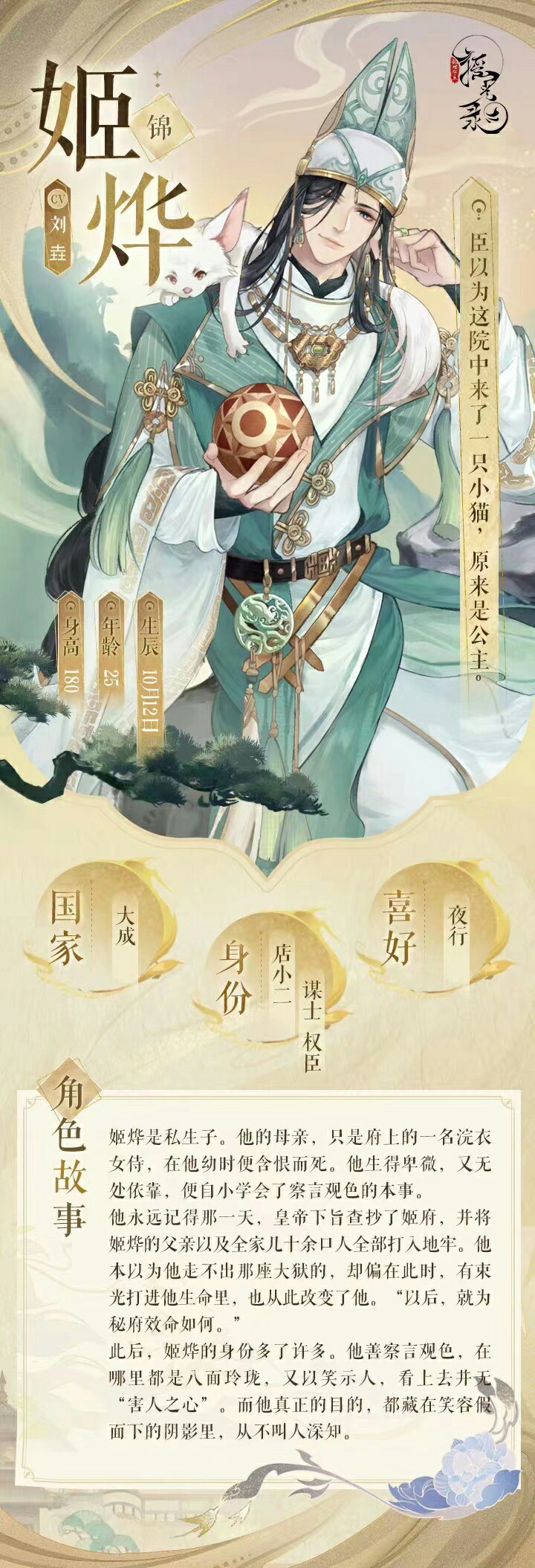 #摇光录:乱世公主#|7月25日正式公测! 唯美国风群像养成手游#摇光录:乱世公主# 「臣以为这院中来了一只小猫,原来是公主。」 人送外号笑面虎,真正的目的,永远潜藏在笑容下,不叫人深知。 他从不与谁亲近,唯独猫除外…… 名士姬烨故事长图奉上,请公主阅之。 👉点我抢先预约抽游戏周边、648基金👈[https://cloudgame.webapp.163.com/reservation/?id=64a536405e7a688956bc1646] =公测福利预告= 🎁【公测祝福】7.25-7.27游玩每日限免30分钟! 🎁【游戏礼包】7.25-7.31 18点 云玩活动页游戏礼包限量派送! 🎁【天天限免】7.25、7.27、7.29、7.31福利中心限免时长礼包限量派送! 💎更多公测期福利,燥候你来~~