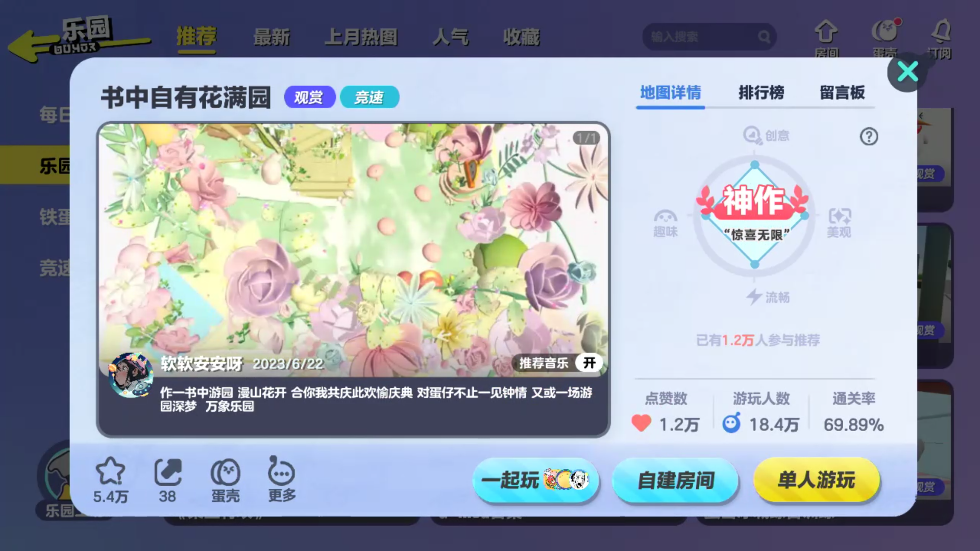 #蛋仔派对地图推荐# #蛋仔派对帮帮团# 今天带来两张好看的地图,喜欢的可以去游戏内打卡呀 top1.书中自有花满园 何处春深好,春深禅宿家看到这些别致的花园庭院,我们仿佛进入了梦境迈进桃花园,一股花香就扑鼻而来,让人陶醉。 万紫千红染春意,芳香恬静吐争艳。枯黄草叶换新装,阶苔浮萍绿如阴。独赏园景心畅舒,唯有痴鸟眷园春。 藏名诗花园里又充满了生机,人们的欢笑声,郁郁葱葱的树上停满了小鸟、鸽子……它们叽叽喳喳地叫着,花园里真热闹啊,毒蛇也被赶走了,处处都是鸟语花香,清新的花园,独处的时光, 可以思考,也可以遗忘 清风拂过,默闻书香, 执一杯香茗,释空心间花园里常年洋溢着孩子们欢乐的笑声,花园里草翠花开,桃树绽出绿芽,开出许多美丽的花朵。 top2.落日沙丘 盘浑圆的落日贴着沙漠的棱线,大地被衬得暗沉沉的,透出一层深红;托着落日的沙漠浪头凝固了,像是一片睡着了的海。沙漠一望无际,到处都是起伏的沙丘。 金色的沙子和风共舞,东风是东,西风是西,交相辉映。地面上形成了一条条深浅不一的颜色波纹,让人赏心悦目。那连续起伏的沙丘真像大海中的波浪一样。 沙漠平展展的,一直铺到天边,在天和地接头的地方,起伏地耸立着锯齿形的沙丘金黄色的沙丘在阳光下一如既往地沉默着,浩瀚连绵一望无际它经过亿万年的沉淀和磨难,安然注视着所有的变化和世事的流转,超然物外