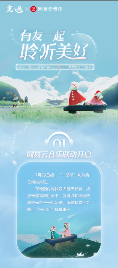 #光遇拾光季#|《光·遇》X @网易云音乐 合作活动即将开启 🎶追寻爱与温暖交织的旋律 🎶邂逅心灵相拥的片刻悸动 请旅人们仔细阅读内容公告,了解更多活动信息 与过路的旅人共享音乐,用歌声诉说相遇 7月29日 《光·遇》x 网易云音乐 一起听功能上线 把耳机分你一半~ 👉点我一键开启云玩👈[cloudgaming://startgame?game_code=gy] #光遇有友节#