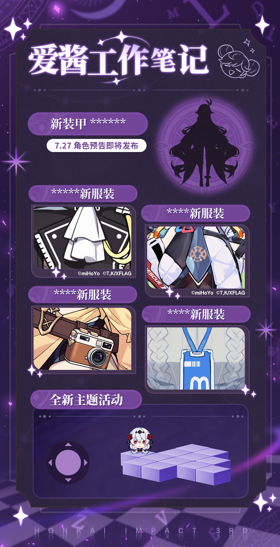 新衣服!就是大鸭鸭的有点简单了哈,直接搬圣痕🌚 皮肤分别是薪炎、爱衣、星棘、大鸭鸭 (薪炎和爱衣的大家也都知道,是联动,至于丽塔和鸭鸭的应该是新活动) 新女武神就不用多说什么了,西琳打复活赛,我猜是s级生物火伤(朋友说是sp的,你们觉得呢?) 新活动就是这次活动的第二章了(都是这样的) 嘉年华上的第二个剪影上的女武神听大家说大概率是崩落德丽莎(我也没看出来,就这样认为吧) 最后我也只想说,老米也太懂bt了吧,爱衣和鸭鸭的皮肤细节给的是……😍 #崩坏3舰长聚集地#