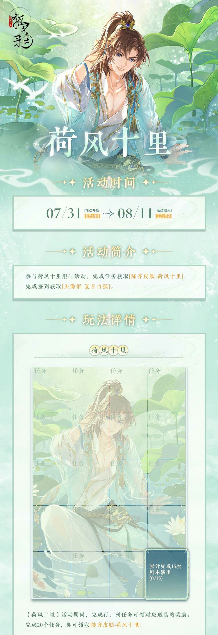 #摇光录:乱世公主# |【游戏更新公告】 陈齐新皮肤登场,全新活动「荷风十里」7月31日开启! 【活动时间】 7月31日(周一)5:00-8月11日(周五)23:59 【活动说明】 1、活动期间,完成对应的活动界面内一行&一列的全部任务可领取对应道具奖励,完成全部20个任务即可领取陈齐皮肤-[荷风十里]。 2、活动期间会同步开启[踏香行]七日签到活动,可以获取[荷风十里]配套头像框[夏月白狐]、青鸾佩、岁时记、紫瑛石等奖励。 👉点我去云玩[cloudgaming://startgame?game_code=ygllsgz]👈
