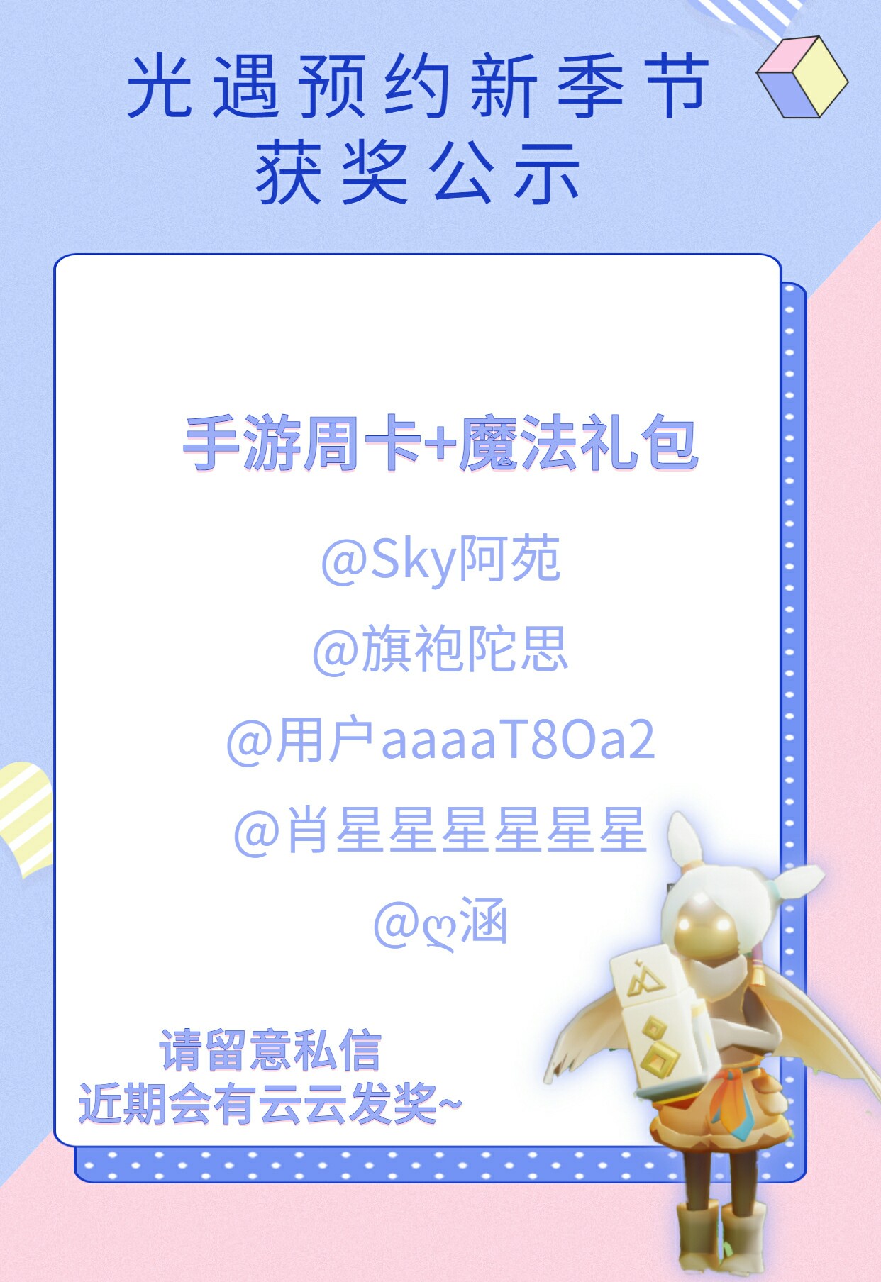 #光遇拾光季#|预约新季节获奖公示 🎂邂逅瞬息万变的自然美景,用风光填充相机的留影 ❤感谢旅人的提前预约,期待下个季节也与你相约~ 🎁恭喜图上的幸运友友获得手游周卡&魔法礼包~ 🎁请于私信处查收奖励~