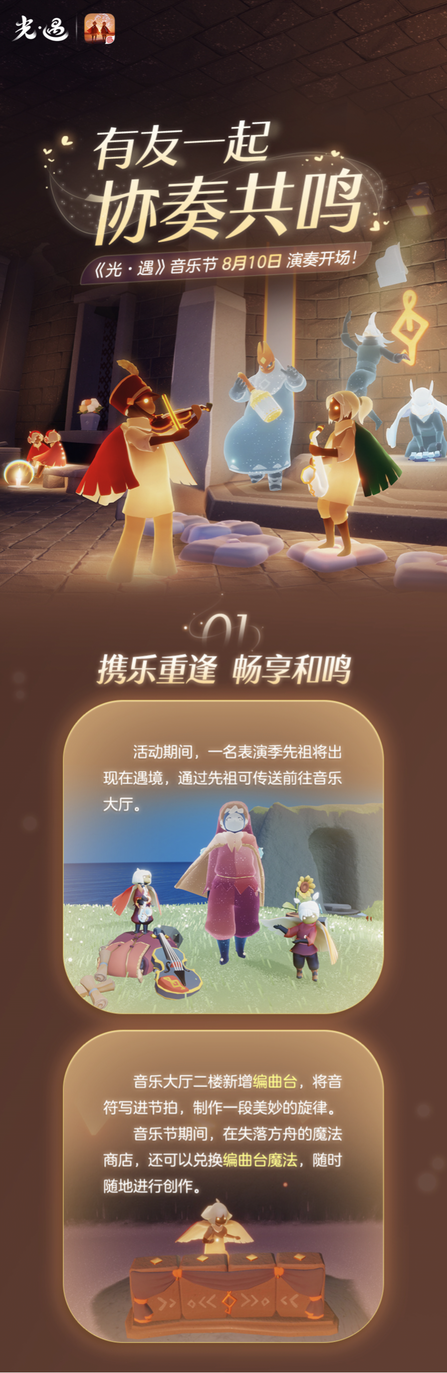 #光遇拾光季#|🎶音乐节开启预告 烛火晃晃悠悠地飘落 暖光洒在纤细的琴弦上 🎙️ 《光·遇》音乐节 将于8月10日 正式开启 请旅人们仔细阅读更新公告,了解更多活动信息 🎷 小光拉着小提琴,为旅人们送上音乐节礼赠~ 让我们戴上礼乐队帽 吹响澄黄的萨克斯 在《光·遇》音乐节 等待演奏开场! ----------------------------------------------------- 🎁【限免礼包】8.10-8.14每日18点 海量限免礼包派送! 🎁【打卡福利】8.10起每日云玩领游戏礼包&次周限免时长! 🎁【音乐挑战】8.10起参与演奏助手【拾光专辑】曲目打分挑战,云云随机抽取1位幸运儿送出奇妙礼遇卡基金(8.25开奖) 👉点我一键开启云玩👈[cloudgaming://startgame?game_code=gy]