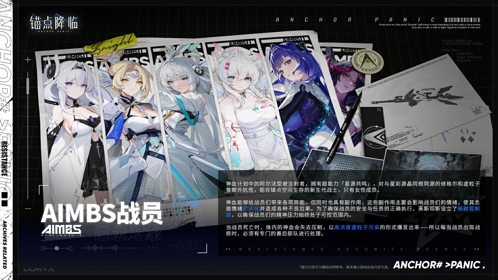 #锚点降临#【莱斯坦斯情报中心】记录对象:AIMBS战员 // 锚点档案库 >> 情报资料:AIMBS战员 神血计划中的阿尔法型被注射者,拥有超能力「星源共鸣」 ,对与星彩源晶同根同源的修格尔和虚粒子有额外抗性,能在锚点空间生存的新生代战士,只有女性成员。 神血能够给战员们带来各项异能,但同时也具有副作用,这些副作用主要会影响战员们的情绪,使其负面情绪扩大化并造成各种不良后果。为了确保战员的安全与任务的正确执行,莱斯坦斯设立了链尉官制度,以确保战员们的精神压力始终处于可控范围内。 当战员死亡时,体内的神血会失去压制,以高浓度虚粒子污染的形式爆发出来--所以每当战员出现战损时,必须有专门的善后部队进行处理。