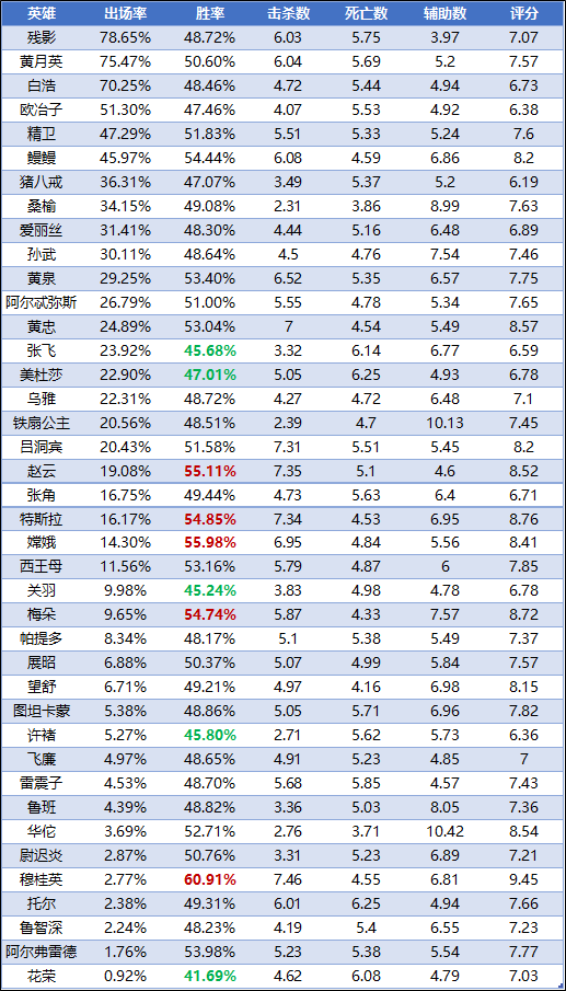 而低于53%的英雄中,白浩和孙武因为是新手赠送的英雄,在庞大的萌新玩家基数下,这两个版本强势英雄的胜率非常低,但是他们仍然处于强势地位。