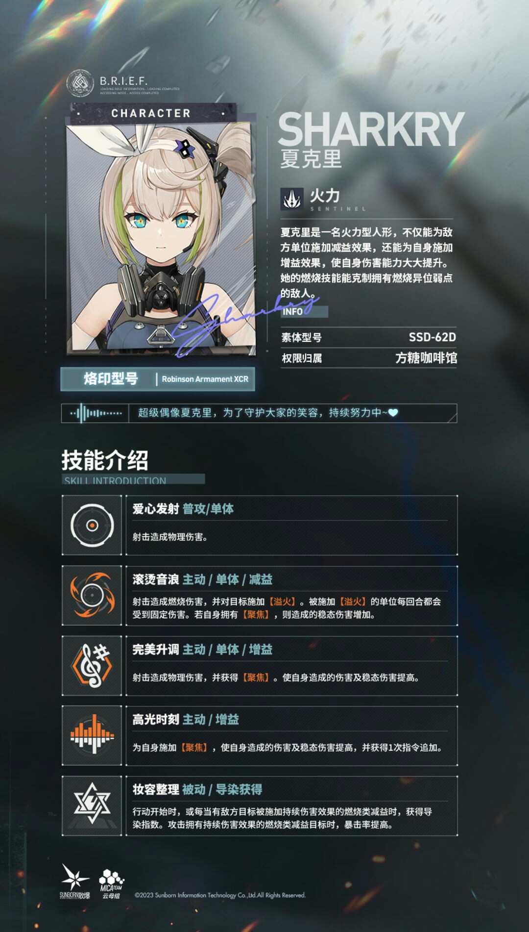 #少女前线2:追放#夏克里是一名火力型人形,不仅能为敌方单位施加减益效果,还能为自身施加增益效果,使自身伤害能力大大提升。她的燃烧技能能克制拥有燃烧异位弱点的敌人。
