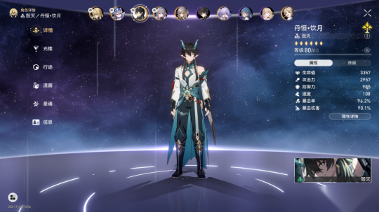 笔者的主c角色名为【0+2的饮月】,属性已经满配,其中暴击率相当高,接近百分之百,因此非常适合用于【繁育】和【巡猎】命运