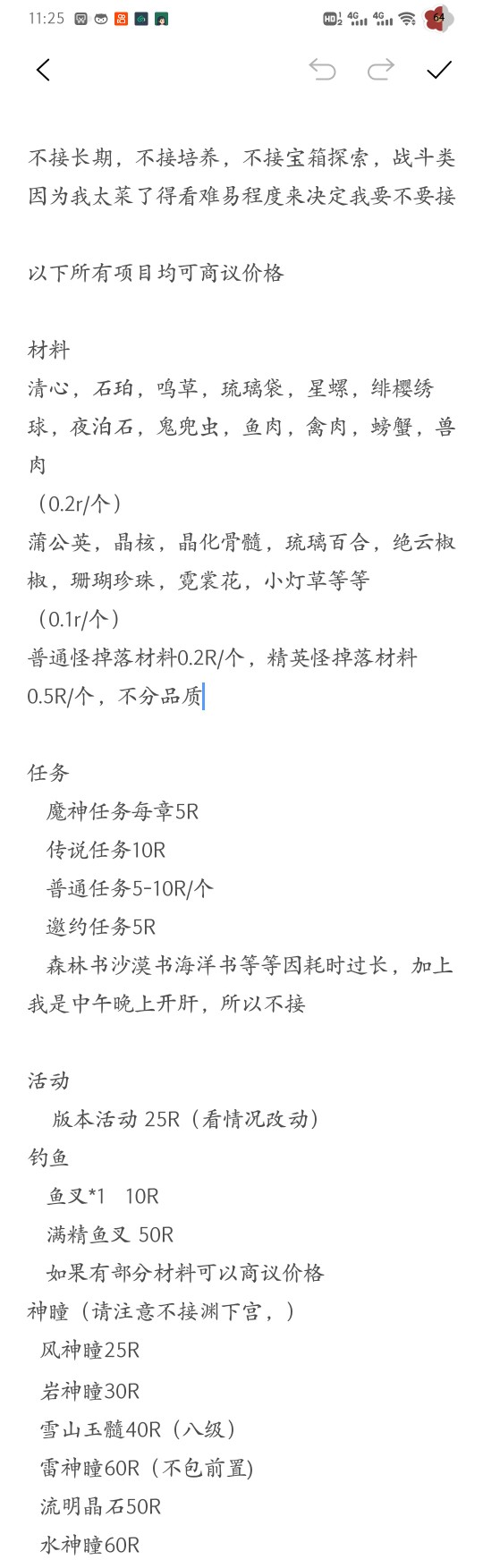 友友们如果需要代肝的话可以找我哦,第一次做代肝,希望大家能支持一下我,承诺不会rong号hui号,只在网易云游戏的一起玩打单子。 现在找我的前5单可直接价格减半,不接长期,不接耗时过长的世界任务,不接宝箱探索,因为要上课所以只在中午和晚上肝,周末晚上在家打不了单子只能早上打。 价格参考了很多代肝的价格,也包括我之前找的代肝,图片内所有项目均可商议价格