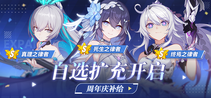 #崩坏3# 【公告】自选扩充补给丨死生之律者、终焉之律者等目标限时UP 自选扩充补给开启! 死生之律者、终焉之律者、真理之律者等目标女武神限时获取概率UP! =====开放等级===== 15级及以上 =====补给时间&内容===== 本次自选扩充补给分为六期,舰长可以根据自身需要,每期任选一位S级女武神作为当期UP目标。(图2) ※活动期间,还将开启以上S级女武神推荐装备对应的自选精准补给,更多详情请见自选精准公告。 =====碎片能量机制说明===== ◆每回补给的副产物(出现在补给结果右侧)为「碎片能量」×50。 ◆每累积一定的「碎片能量」,这些「碎片能量」将转化为当期UP的S级女武神碎片(或灵魂)×1。 若当期目标S级女武神为非灵魂觉醒角色,则累积210能量可兑换其碎片×1 若当期目标S级女武神为灵魂觉醒角色,则累积100能量可兑换其灵魂×1 ◆当期自选扩充补给中获得的碎片能量不会继承到下期自选扩充补给中。 ◆舰长可以在补给界面查看「碎片能量」的累积进度,以及当期目标S级女武神距离SS、SSS的晋升进度。 ◆同一期自选扩充补给中,切换UP女武神时碎片能量将保留。若切换后剩余碎片数量满足兑换条件,则会自动转化为切换后的UP女武神的碎片(或灵魂)。 =====自选扩充补给说明===== ★自选扩充说明 ◆每期自选扩充补给中,将会有3位S级女武神作为可选择的补给UP目标。舰长可以根据自身需要,任选其中1位开启扩充补给哦~ ◆每期自选扩充补给开启时,系统会先为舰长选择当期推荐的S级女武神作为UP目标。舰长可以随时通过点击“重置”按钮,更换UP的S级女武神。 ◆对于每期自选扩充补给,舰长有5次重置UP目标的机会。重置后,会继承十回补给必出A级或以上女武神角色卡、百次必出S级女武神的次数。 ★保护说明 ◆十回自选扩充补给必出A级或以上女武神角色卡,至多一百回自选扩充补给内必出目标S级女武神角色卡。 ◆自选扩充补给和扩充补给【百次必出S级女武神】的次数相互继承,即两种扩充补给共用一个保护次数。 ◆每期自选扩充补给都会继承上期【百次必出S级女武神】的次数,直到舰长获得该期对应S级女武神为止。获得S级女武神后会重新开始计算次数。例如:舰长在本期自选扩充补给结束时界面显示【剩余20次补给必出】,那么在切换UP的S级女武神或者下期自选扩充补给开始后,舰长在20次补给内必定能获得下期自选扩充补给的S级女武神。 ◆有关详细的获取概率信息,请参照当期补给详情界面的【概率详情】。 ======商城特惠礼包====== ★★★自选扩充支援礼包(小)★★★ 【上架时间】9月22日12:00~10月10日12:00 【开放等级】20级及以上 【礼包内容】扩充补给卡×5,水晶×188 【礼包价格】礼包售价为980礼包币,活动期间限购1次。 ★★★自选扩充支援礼包(大)★★★ 【上架时间】9月22日12:00~10月10日12:00 【开放等级】20级及以上 【礼包内容】扩充补给卡×10,水晶×288 【礼包价格】礼包售价为1980礼包币,活动期间限购1次。