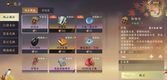 一)怀珍令:今天在风云商店中可以再次兑换一个怀珍令,用于兑换老独珍的装备。