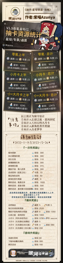 请注意:......1. 总数中不包括混沌回忆、角色突破、短信等每个人获取数目不同的内容,但详细列表中会有计数。各位可按照自己的情况自行往上加!由于限时活动的顺序暂时未知,因此在这里将狐斋志异和盘岩镇斗技表演赛计入上半部分,另一个活动计入下半部分。如果到活动时间公布后发现不符,我会重新更新上半部分的数据,大家也可以自行加减计算。