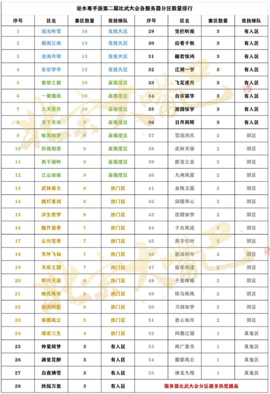 综上所述,本文详细介绍了逆水寒手游的分区命名和赛区数量,瑶光听雪以16个分区数量位列首位,每一个分区都拥有独特的称号。比武大会的赛区数量升级,增加了比赛的竞技性。我们通过大神聊天室绑定人数和赛区数量两个指标,对各个服务器的玩家数量和活跃度进行了统计和分析。比如,>10个赛区的服务器是最热门的几个服务器,9~10个赛区的服务器人气很高,6~8个赛区的服务器的中坚力量十分扎实。但是,24名之后的服务器活跃度就开始下降。欢迎大家来我们网易云游戏的平台上进行相关交流讨论。