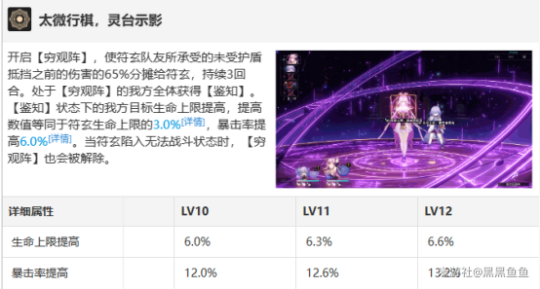 【穷观阵】可以在全队现有的承伤上限内延长存活时间,但无法增加全队的承伤上限,从而有效确保全队在短时间内不会有成员减员。 【穷观阵】以符玄自身的回合为准,不受队友速度快慢的影响,可以覆盖全队。 【穷观阵】增加的生命上限相当于增加承伤上限,但增幅较小,而增加的暴击率可以有效降低全队装备配置的难度。