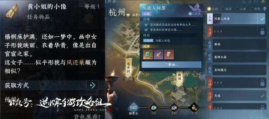 杭州(960 1436)与曾如云进行对话后,选择"声援婆婆"后来到了杭州(956 1356)与曾如云再次对话,选择"上前询问"。对话结束后,获得了黄小姐的小像。在背包的任务栏中找到画像,可以得到线索"黄小姐与凤还巢颇为相似"。而凤还巢正是风尽扬州的最终boss!该道具小暖提示当前版本暂无用途,需等待后续版本更新。