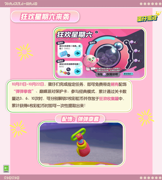 这是《蛋仔派对》的全部内容!针对喜欢这款游戏的玩家,我们每天都会提供最新最全的攻略。星期五已经过去了,现在让我们快乐地迎接【狂欢星期六】吧!最新版本即将重磅登场,让我们与皮蛋一起揭开蛋仔岛的最新情报吧!🌙狂欢星期六🌙只要蛋仔们完成特定的任务,就能免费获得稀有的配饰“弹弹拳套”和巅峰派对保护卡。参与经典模式并累计通关指定次数,就能获得彩虹币。只要狂欢收集罐中积累到6枚彩虹币,就可以一键提取!🌙午夜剧场焕新🌙
