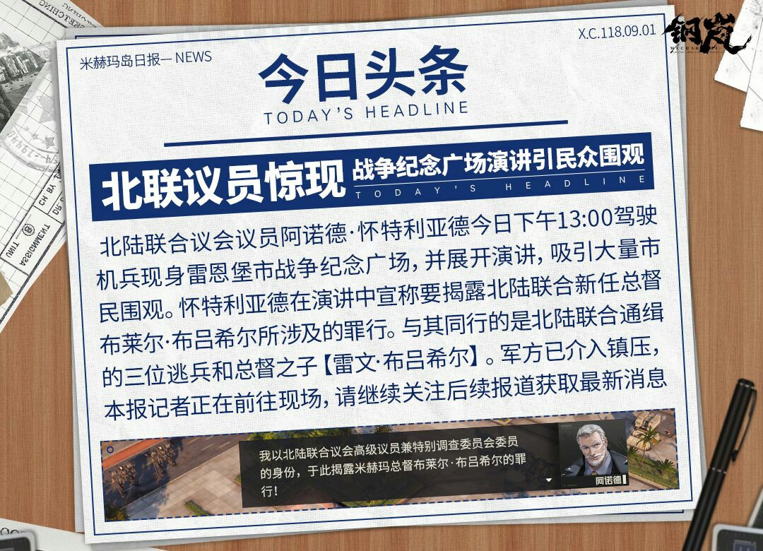 #钢岚# 周刊米赫玛·文娱版:北陆联合议会议员「阿诺德·怀特利亚德」 今日米赫玛日报头条惊动世界政坛,一位北陆联合议会议员出现在雷恩堡市战争纪念广场,驾驶机兵展开激情演讲,并扬言要揭露新任总督***·布吕希尔在就任后所犯下的罪行。而这位议员就是我们本期周刊的主人公「阿诺德·怀特利亚德」,这位年过半百的政客,又有着怎样的波澜人生呢? 十六岁时阿诺德就投身到和平事业当中,成为了一名反战斗士,并在政坛为这个世界上的不公而发声。作为鸽派政治家,他希望以建立统一富强、人人平等的米赫玛为政治蓝图。身材魁梧,严谨的西服之下是与年龄不符的健硕肌肉。对于自己的立场和处境有清晰的认知,在日趋恶劣的米赫玛政局中坚定地践行自己的理想。 但是身在政坛,有时候真相会比理想更令人绝望。本来已经到了退休了年纪的阿诺德,却因为政敌的上位。决定要登岛揭露真相,因为他知道***上台,并不会让米赫玛当下的局势变得更好,反而会让岛内边境关系更加紧张。更何况在十五年前米赫玛战争时,他就是造成米尔萨斯爆炸事件的罪魁祸首。 他决定用自己的力量将这位道貌岸然的新总督拉下马,并让他为这些年的罪行付出应有的代价。所以他才特意选了纪念广场,希望能用自己的力量,为米赫玛争取和平。 情报披露 作为已经年过半百的议员政客来说,阿诺德在机兵的选择上格外中意重型的双足机兵。这款卡戎就很符合他的喜好。作为ASX-1144的防护特化型,核心是强化后的耐冲击元件,并在机体装甲上采用了更坚固、更完整的防护替换件,这一系列针对防护性的改进,促使卡戎成为了同时代重型机兵中最大最重的型号。 作为守护者的鸽派政客,阿诺德在战场上的主要职责就是守护队友,为同伴提供强有力的后盾支持。但在提供支援的同时,也可以利用手中的轻型步枪,给敌人致命一击。 政客的生涯往往是很短暂的,但对于阿诺德来说,五十年的时光似乎又太漫长了。如今,他早已对无数人趋之若鹜的权力场,没有什么留恋的了。或许一开始,他的初衷就只是想为这世界的不公而发声,为和平而战,或是从战争的背后寻求真相而已,尽管已到花甲之年,也依然不忘初心。 「在电视上见过我?我是阿诺德·怀特利亚德,北陆联合议会的议员。我保证议会能妥善处理米赫玛的事务,给所有人一个满意的答复。」