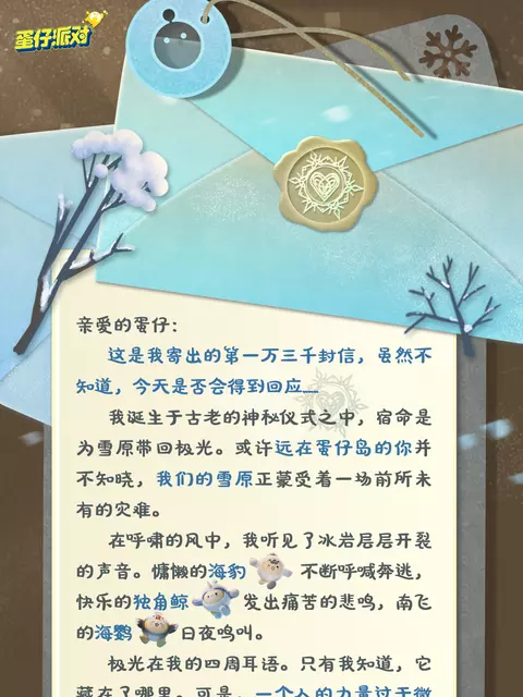 蛋仔派对中,你会收到一个装着信笺的漂流瓶。漂流瓶透露着一丝凉意,信封上烙印着冰晶纹理的火漆。你打开信封,发现这是一封来自雪原之心伊芙的求救信。信中清晰地描述了遥远雪原上正在发生的危机。我们将为喜欢这款游戏的朋友每天提供最新、最全的攻略。