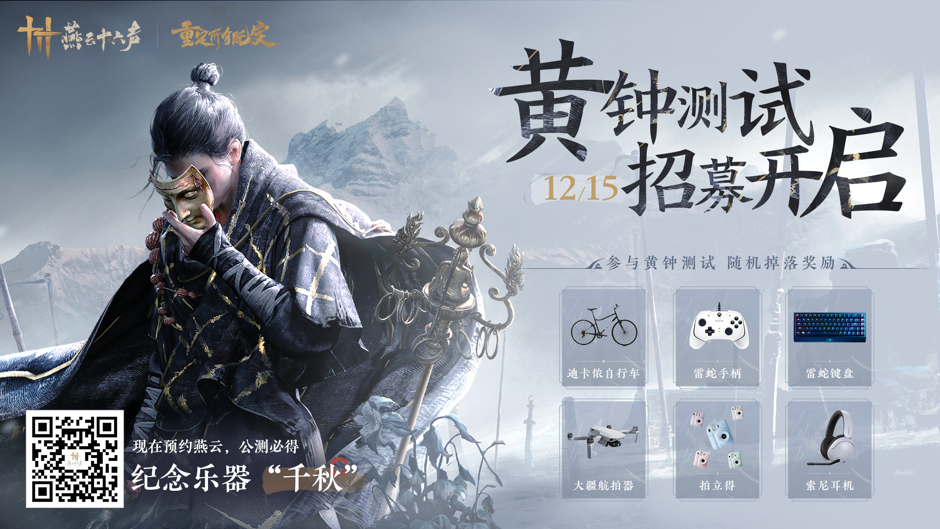 感谢诸位期待,《燕云十六声》黄钟测试将于12月15日开启。 关于黄钟测试,想必大家有诸多疑问。 在此,十六整合了一些常见的问题,在此与诸位解答。 1、本次测试定性? ——黄钟测试限量不计费删档,测试结束后,服务器将对玩家数据进行清空。 2、本次测试的平台? ——本次测试仅限PC端,所有体验内容均为开发中版本,不代表游戏最终品质。更多平台适配仍在进行中,敬请期待。 3、如何获取测试资格? ——本次测试将通过以下几种方式发放: ①官网预约,我们将从问卷中随机筛选发放,欢迎玩家朋友前往官网预约。 ②关注“燕云十六声”官方账号(微信、微博、抖音、大神、taptap),十六会通过抽奖活动等方式发放少量测试资格。 ③预留了少量测试资格,供合作品牌、媒体伙伴体验评测。 4、测试报名截止时间? ——本次测试报名截止时间为2023年12月11日24:00,请有意参与测试的游侠安排好时间,及时填写招募问卷。 5、填写问卷时游戏经历越丰富、设备配置越高,获得资格的概率更高吗? ——测试资格将由问卷中匹配的不同类别、不同配置玩家中随机筛选决定。为了更客观的调研玩家数据,帮助燕云优化成长,请玩家朋友们根据实际情况如实填写问卷,感谢。 6、每个测试资格可以登录几台设备? ——每个测试帐号只能绑定一台PC设备,手机号登录后与设备绑定,该帐号将无法在其他设备上进行游戏,因此请参与测试的游侠在第一次登陆时选择好设备。 7、本次测试的PC配置要求是什么? 【最低配置】 系统:Windows 10/11 64位 CPU:I7-9700/锐龙5 3600X,及同等性能设备 显卡:GTX 1060(6GB)/RX 480(8GB),及同等性能设备 内存:16GB 固态硬盘SSD预留100G 【推荐配置】 系统:Windows 10/11 64位 CPU:I7-10700/Ryzen5900 显卡:RTX 2070 SUPER / RX 6700 XT 内存:32GB 固态硬盘SSD预留100G 【高性能配置】 系统:Windows 10/11 64位 CPU:I7-12700K/锐龙9 5950X 显卡:RTX 3080 / RX 6800 XT 内存:32GB 固态硬盘SSD预留100G 注:下载燕云包体后至本次测试期间,请勿重装系统,否则可能导致资格失效而无法进入游戏。 8、本次测试是否可以使用手柄体验? ——可以,本次测试支持使用Xbox或PS手柄体验。 9、是否可以转让测试资格? ——不可以。如获得测试资格,仅供参与招募的本人使用,禁止任何形式的转让、售卖。一经核实将回收测试资格并追究责任,感谢理解。 10、是否可以将游戏内容以直播、视频、截图等形式发布到社交平台? ——本次测试将不会对玩家合理的分享传播做严格限制。但本次测试所有体验内容均为开发中版本,不代表游戏最终品质。同时,针对拆包、盗用、恶意抹黑等侵权行为,我们将保留追究法律责任的权利。 11、参加过上次的「蕤宾测试」,依然可以参加本次「黄钟测试」吗? ——可以,两次测试互相独立,此前的报名和资格不影响本次测试。如有意向参加本次测试,请按照要求填写招募问卷。 12、为什么叫“黄钟测试”? ——我们将本次测试命名为“黄钟测试”,取自十六声中的第一声,其声浑厚,可喻山川地理。希望诸位玩家的燕云游历如同黄钟之声,浩荡长存,期待与各位相遇。