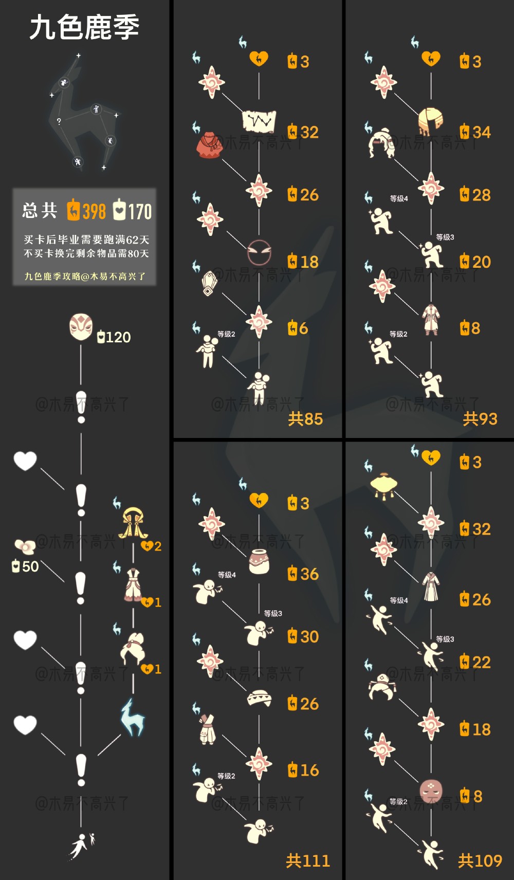 【九色鹿季】全物品+价格兑换图展示 ——————————————————— #光遇##光遇九色鹿联动# #光遇联动九色鹿# #光遇九色鹿# #光遇联动上美影# #光遇帮帮团# 🔵季节1月15日更新后开启! 🔹毕业需要398根蜡烛,买卡后跑62天。 🔹不买季卡换完物品需要80天。 🟠本季两个礼包, 🔸鹿角+月牙面具--98元 🔸莲花斗篷--------128元 🔻莲花斗篷将在后续添加特殊功能 ⚪️向导兑换树两个物品 ▫️莲花头饰--完成任务三后50蜡烛兑换 ▫️鹿面具----完成任务五后120蜡烛兑换 🔻仅在季节期间兑换 转载:木易不高兴了