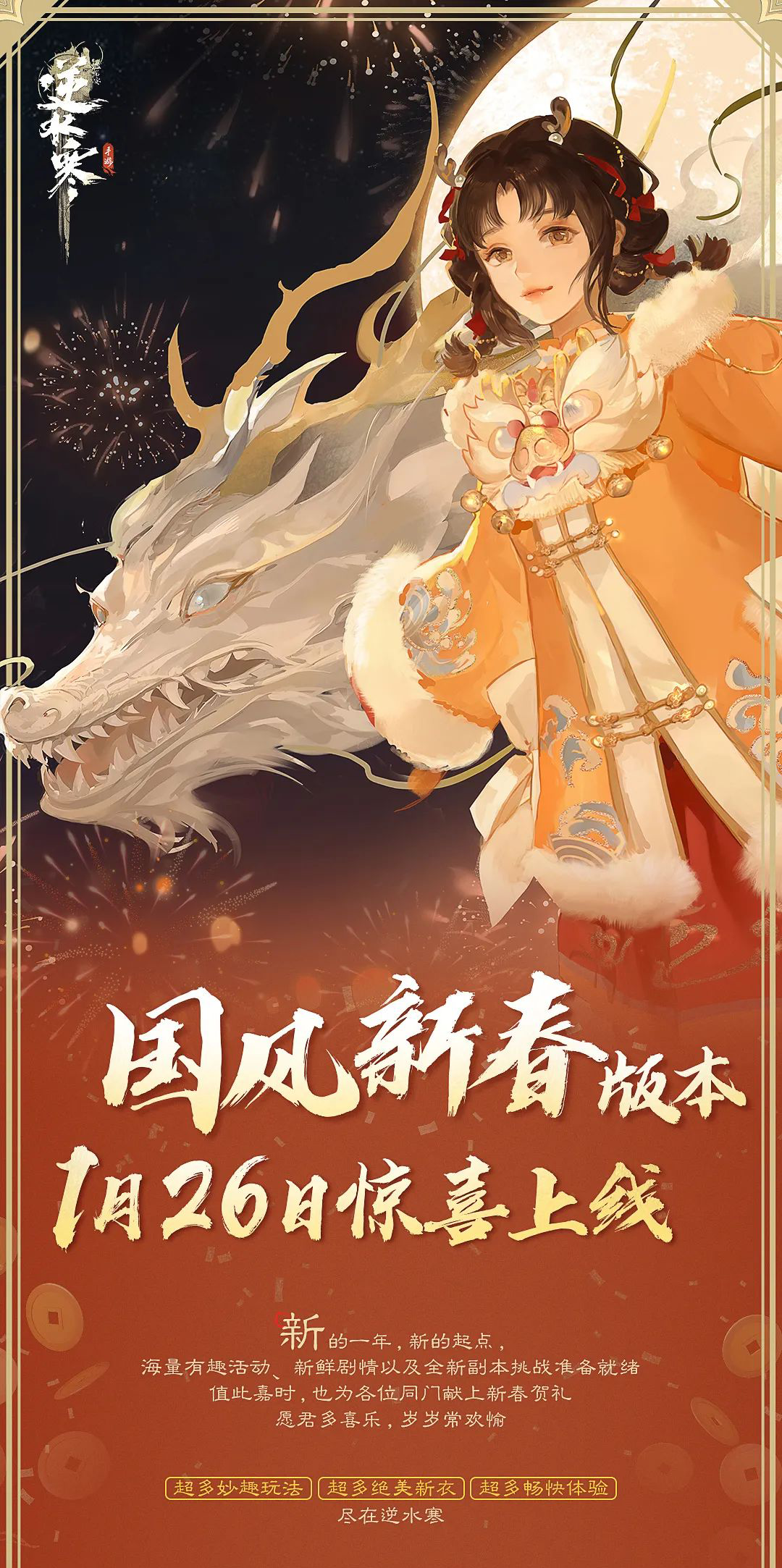 #逆水寒手游# 恭喜所有逆水寒玩家,您今年将过两个年! 【新春版本大预告】(上) 恭喜大家,今年一次能过两个年,享受双倍的快乐: 一个是现实中的年。 一个是逆水寒手游中即将开启的最有过年年味的大宋年! “逆水寒是在玩什么新型文字游戏吗?”当然不是,我们是诚心诚意希望大家能在游戏中度过一个最具正统中国味的国风欢乐年: 为此,开发组不仅翻烂了《宋史》《东京梦华录》《梦梁录》《武林旧事》等几十万字描述宋朝风土人情的经典古籍,更是邀请杨丽萍、凤凰传奇和一众非遗大师组成龙年“国风天团”深度参与游戏开发和监修,只为做好一件事:在“会呼吸的江湖”这片虚拟时空中,用最严苛的态度全景式还原“一千年前的人民到底是如何过节的”。 您,作为一个武学出神入化、财富腰缠万贯、人脉纵贯朝野的当红自在门人,平时已经够自在、够撒欢、够快乐了;要是又碰上史上细节最还原、最有沉浸感、福利最多的繁华大宋新年,到底能获得多么想象不到的快乐? 1月26日新春版本即将开启,这一切均将有答案。请看长图预告: