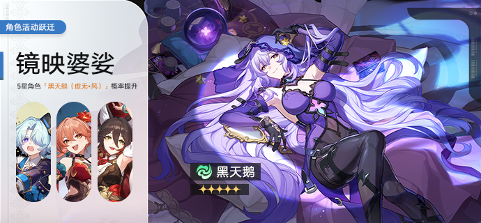 #崩坏:星穹铁道# | 角色活动跃迁:「镜映婆娑」、「濯世垂虹」 亲爱的开拓者: 本期角色活动跃迁时间为 2024/02/06 2.0版本更新后 - 2024/02/29 11:59,包含如下内容: ▌「镜映婆娑」角色活动跃迁 ● 活动期间,限定5星角色「黑天鹅(虚无•风)」,4星角色「米沙(毁灭•冰)」「停云(同谐•雷)」「桂乃芬(虚无•火)」跃迁成功概率限时提升。 ▌「濯世垂虹」角色活动跃迁 ● 活动期间,限定5星角色「丹恒•饮月(毁灭•虚数)」,4星角色「米沙(毁灭•冰)」「停云(同谐•雷)」「桂乃芬(虚无•火)」跃迁成功概率限时提升。 ※以上角色中,限定角色不会加入「群星跃迁」。 ※活动期间,限定5星角色「黑天鹅(虚无•风)」仅可在「镜映婆娑」角色活动跃迁中获取,限定5星角色「丹恒•饮月(毁灭•虚数)」仅可在「濯世垂虹」角色活动跃迁中获取。 ※活动结束后,4星角色「米沙(毁灭•冰)」将在2.1版本加入「群星跃迁」,但不会加入「始发跃迁」。 ※以上跃迁属于「角色活动跃迁」,跃迁次数保底完全共享。在任意「角色活动跃迁」中未获取5星角色的累计跃迁次数会一直共同累计在「角色活动跃迁」中,与其他跃迁的跃迁次数保底相互独立计算,互不影响。 ※详细信息可前往跃迁系统查看。 ▌材料关卡限时提前开启 ● 活动时间:2.0版本更新后 - 2024/03/07 11:59 ● 活动说明:活动期间,「黑天鹅(虚无•风)」「丹恒•饮月(毁灭•虚数)」「米沙(毁灭•冰)」晋阶材料与行迹材料的关卡将限时提前开放。若开拓者并未解锁对应关卡,可通过「星际和平指南-生存索引」直接挑战。 ● 本期开放: 凝滞虚影:天人之形、偃偶之形、冰酿之形 拟造花萼(赤):虚无之蕾•丹鼎司、毁灭之蕾•收容舱段、毁灭之蕾•鳞渊境 ▌「锋芒崭露」角色试用活动 ● 参与条件:开启「旅情事记」 ● 活动时间:2.0版本更新后 - 2024/02/29 11:59 ● 活动内容:可试用角色「黑天鹅(虚无•风)」「丹恒•饮月(毁灭•虚数)」「米沙(毁灭•冰)」「停云(同谐•雷)」「桂乃芬(虚无•火)」体验关卡,达成挑战后,可获得星琼、冒险记录、通用培养材料、信用点奖励。