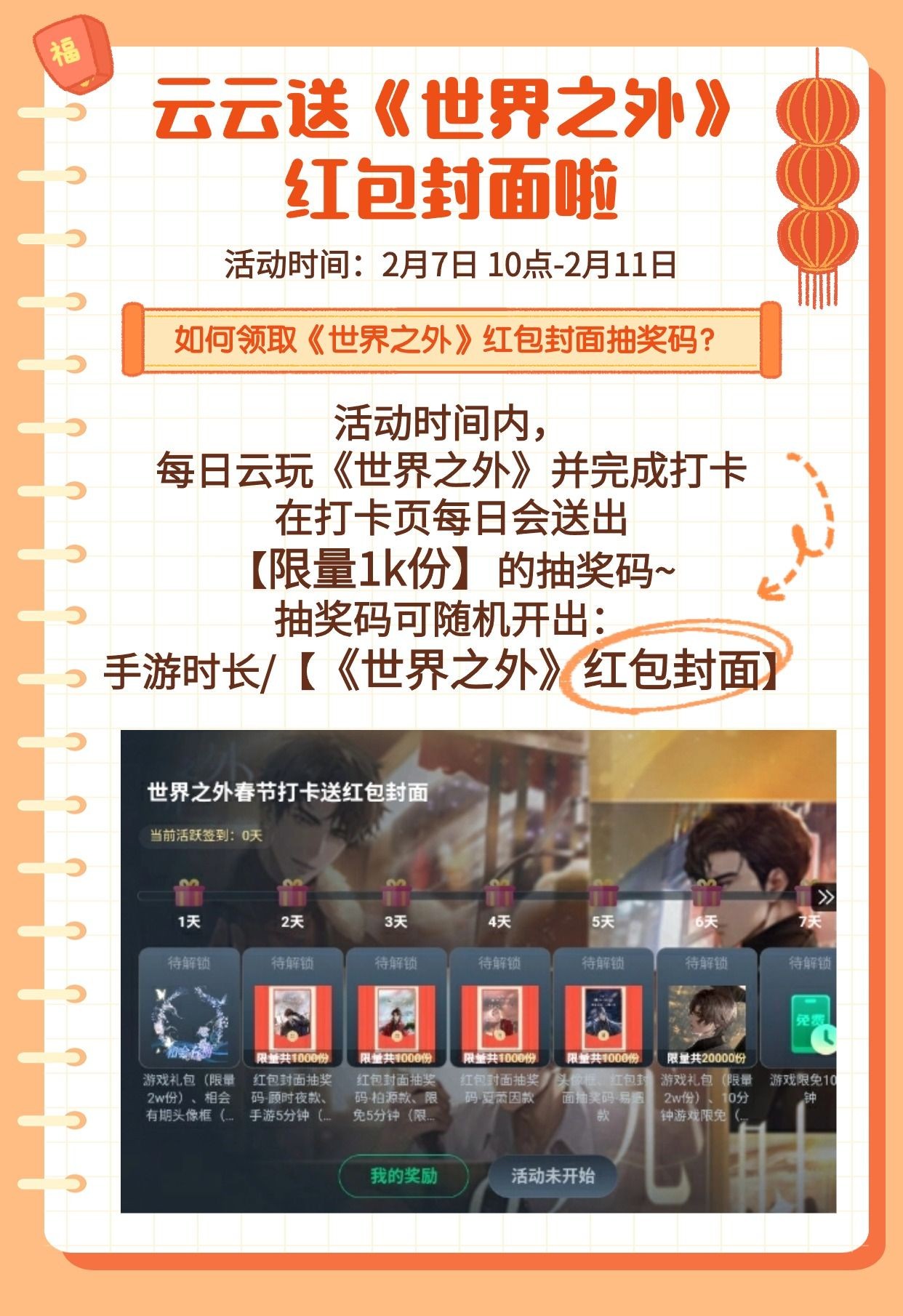 #世界之外#|🧧云玩世界之外送红包封面 〓限定活动​「心动时刻」2月7日开启! ⏰2月7日-2月11日,云玩世界之外抽送红包封面! 本次共计发放四款红包封面,分别为: 顾时夜✦风雪归人 易遇✦逢魔 柏源✦许你长安 夏萧因✦花好月圆 💕红包封面的具体获取规则及兑换规则见图💕 💕2月7日 18-22点 前往【一起玩】参与世界之外抽卡也有机会获取💕 “世界无限,此爱不变” ——··——··—— 👉点我查看「心动时刻」版本详情[cloudgaming://jumpBroadcast?id=65c0b96d52dc1667cb30fdb5]👈 👉点我一键开启云玩[cloudgaming://startgame?game_code=sjzw]👈 👉点我前往抽取648R游戏基金[https://cloudgame.webapp.163.com/pt/?id=650959321fc75bbbb837628d]👈