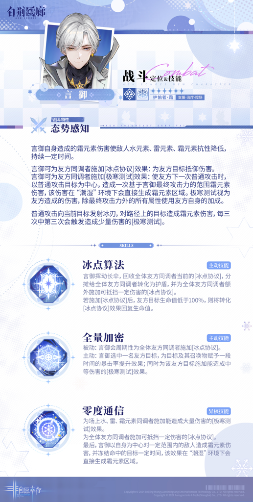 另外,大招【零度通信】集附魔、挡伤和控制为一体的技能,详细机制之前提过了,生成大范围的霜元素区域也是一大亮点。白荆回廊是一款非常有趣的游戏,其中有许多角色拥有强大的技能和增益效果。例如,言雀队长可以提供60%的增伤幅度和乘区,这使得没有抽到言雀的水雷霜队也能够发挥出强大的战斗力。此外,言御也可以作为队长发挥重要作用。这些角色的技能搭配和运用为游戏增添了更多的乐趣和策略性。