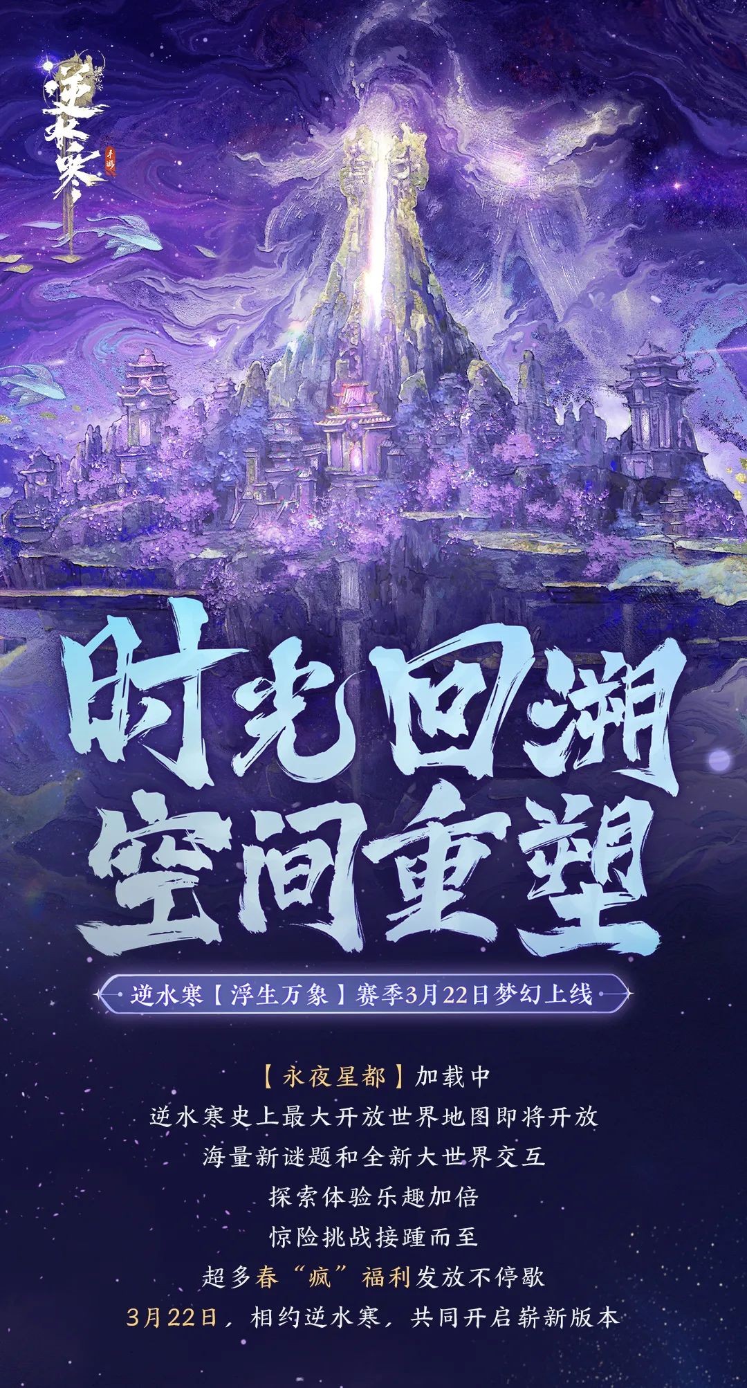 再过7天,逆水寒1.3赛季陪你撒春疯【赛季更新大预告】 评论区发布你对1.3版本的期待,点赞最多且符合要求的评论,必得「手游周卡」! 版本预告让我们先睹为快!↓↓↓ 春天是用来干嘛的?撒疯! 切莫辜负好春光!这不,传统MMO颠覆者·赛季制开放世界MMO开创者·游戏圈价格战发动者·MMO圈“疯王”逆水寒携着它“最疯狂”的大型资料片,来了! 7天后的3月22日,逆水寒1.3“浮生万象”新赛季上线,开发组们早早为各位大客户准备好了多重疯狂—— 疯狂的星都美景,如梦似幻; 疯狂的更新内容量,量大管饱、轻松自由无压力; 疯狂的时间倒转谜题,脑洞大开; 疯狂的社交互动,撕破禁忌; 疯狂的各类副本,风雨事、挑战本和大型团本均有更新,各个恢弘热血; 疯狂的AI剧组模式,首创更新,人人都可成为导演,下一秒即可将目前最流行的舞乐用自己的角色拍出; 疯狂的全新剧情,国家队大师加盟,一起让传统戏曲文化在逆水寒中焕发全新的超唯美演绎; 疯狂的闲趣玩法,庄园欢乐、休闲棋牌、开场演唱会、各种脑洞大开的创新身份玩法应有尽有,您可一心一意“住在”逆水寒; 疯狂的外观更新,唯美设计,超高精度品质,超高自由度搭配,由您来引领新赛季的美学流行趋势; 疯狂的PVP更新,永夜特色战场主题来袭,上分超快超爽,PVP向装备获取方式更丰富,啥也不干只打架也能神装毕业; 疯狂的平权模式,殊途同归,自由选择,新老玩家都能快速实现属于自己的武侠梦; …… 当然还有最重要的,疯狂的福利!新赛季的福利,3张代金券,4套免费时装,大宋零元购,海量福利上线动动手指即领,人来就送! 新赛季,入坑最佳时机 只呈上最重磅更新 逆水寒开创了开放世界武侠MMO赛季制的先河,此次更新为第二次赛季切换,比首次赛季切换更成熟,也更隆重。 一方面,不管是新玩家、老玩家、回流玩家,都能在一到两周内体验到游戏最核心的乐趣,没有任何追赶的压力; 另一方面,海量更新来袭,绝对要为各位同门送上一场绝佳的江湖体验。所以,此次新版本,逆水寒将迎来四最: 史上最大、最梦幻、 机制最独特开放世界地图 最大开放地图,【永夜星都】即将上线,新版本更新后,将会有大量富有新意的新谜题等待大客户探索,同步会有全新机制展现(如时空倒转)。作为逆水寒史上最大开放地图,各位大客户在探索时可不要迷路了! 当然,如果大客户们想要出手探究【永夜星都】的秘密,那就可要小心了,全新12人团本同样也在此处!在这里,踏错一步便有可能万劫不复!毕竟,这里可是“父亲大业”所在之处。 最多福利免费送 新赛季内,小寒将会硬送各位大客户四套永久时装,更有大量签到赠礼! 只要来了,我们就送! 您将会获得:签到即领的半价券3张;大量折扣券;永久时装4套等等超多福利! 最有趣玩法大集合 借1.3新赛季更新的东风,逆水寒将同步推出更多更有新意的玩法。 首先自然是前期有过重磅预告的棋牌大厅与全新的身份玩法,以及最值得期待的剧组模式。之后,同门们在江湖里,可以随时随地打牌打木桩,还能演绎各类名场面,更能获取更多隐藏身份配饰!全新的庄园组件,还能让您一秒到达游乐场,立省门票钱! 其次,爱打竞技的同门们也有福了。竞技玩法浮生万象S1全新主题,将带来天气、机制、强敌、地图、音乐全方位更新,打竞技更有动力了呢!当然,开发组们也不忘对PVP段位系统及PVP装备获取机制进行优化更新,新赛季,上分更快,获取装备更优! 休闲党、竞技党都能在新版本感受到全新玩法,开发组们又怎么会忘记副本党呢!全新十二人大型团本【永夜星都】,终极boss柳沧海等待您的挑战!要是还不过瘾,您还可以携手少年戚少商,对抗乌衣堂;在孟临渊的心境中展开更加疯狂与奇幻的冒险;去寻找野外首领挑战自己的极限......更多新玩法,只等您的上线! 小寒只能说,江湖的自由度,又上了一个台阶呢! 当然更新再多,您也不会觉得肝觉得累,所有玩法自由选择,没有强迫一定要玩的模式,就算种地谈恋爱也能“上王者”,嘻嘻哈哈,奖励拿满! 最友好的赛季机制, 入坑回流最佳时机! 这是“逆水寒特色赛季制”最大的意义之一:让新玩家/回流玩家可以随时入坑并追赶跟上大部队,完全不用担心进度落下!一两个星期甚至几天就能快速提升到较高水平战力,体验到新赛季的全部精彩。 新玩家福利超级多,可通过萌新专属的【萌新攻略】【武林初芒】以及专属补领商店【初入江湖】,送你萌新专属装备、补领积分等,光速追赶前辈、光速提升不迷茫; 回流玩家还有【江湖重逢】专属活动,可领取时装、天赐伙伴、自选独珍装备、自选稀有内功等丰厚奖励。好久没玩不知道怎么提升?不存在的,全新AI加持的【成名赏】系统,私人战力诊断,哪里不足提升哪里,按图索骥,变强就是如此简单! 新老玩家玩不到一起去?不存在的!“江湖不掉队”老带新活动海量福利,新老玩家都有奖,还有天赏石大奖等着你! 号外:千呼万唤! 专属白帝城的曲目来了 琴心剑意曲中闻,高山流水觅知音。 春暖花开之季,神相音动之时。 神相流派推广曲即将于3月22日和大家见面。 一位神秘的实力派艺术家即将正式加盟“逆水寒国风天团”,担任神相流派乐使。 他,拥有贵气优雅的嗓音, 拥有华语顶级水平的唱功, 被称为行走的CD机、一条过天王。 更有逆水寒神秘江湖老友倾情加盟,一琴一剑守护苍生,3月22日,一起在逆水寒江湖中感受神相的飘逸绝尘,遇见属于