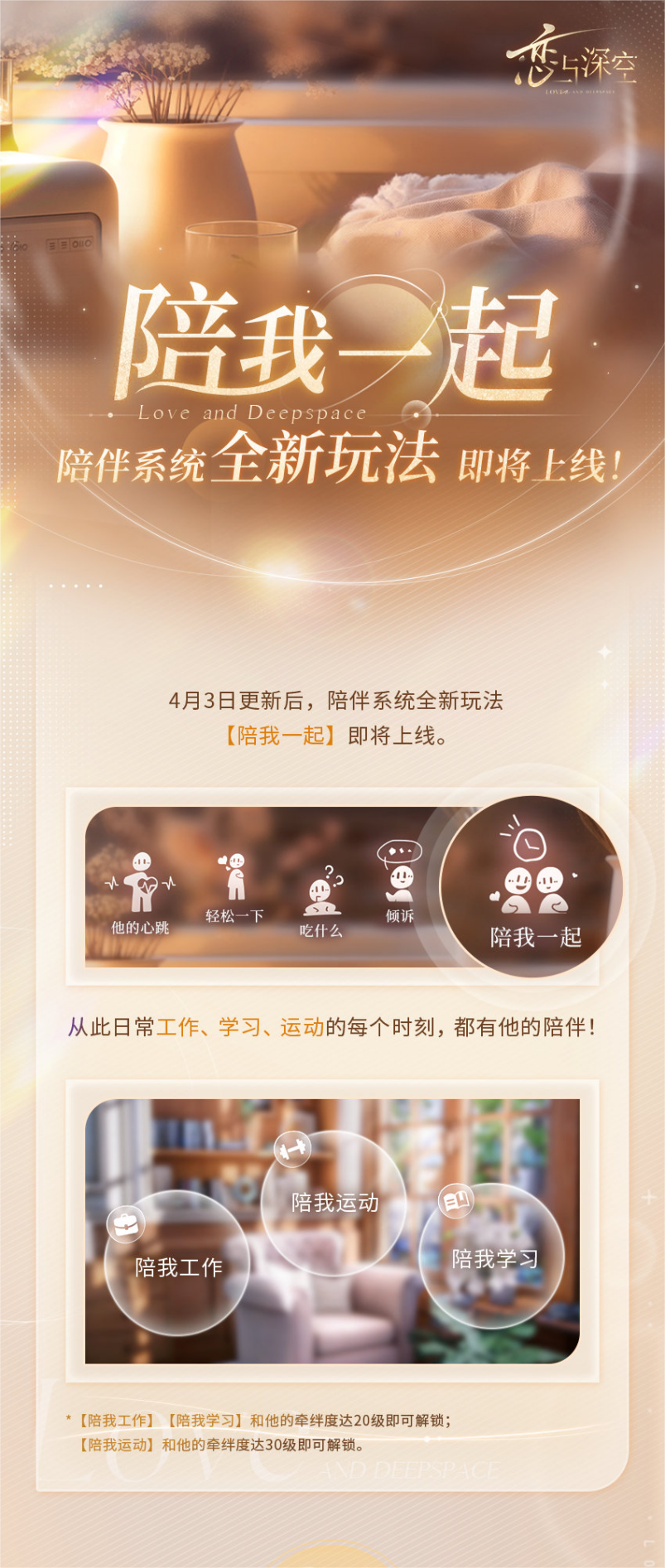 #恋与深空#|陪伴系统全新玩法「陪我一起」即将上线! 运动、工作、学习……每天进步多一点,想做的事都有他陪在身边。 🏃一起运动!360°沉浸锻炼陪伴 和他的牵绊度达30级,即可解锁「陪我运动」功能。 1.邀请他一起完成运动目标吧!他会换上运动装束,陪你一起完成锻炼计划。 2.挥洒汗水、心跳加速的过程中……他的状态会和你一起变化,感受起伏的呼吸吧! 3.拖动或缩放屏幕仔细观察他吧,每个细节都是努力的证明! 📖一起学习&工作!面对面的专注时刻 和他的牵绊度达20级,即可解锁「陪我工作」「陪我学习」功能。 1.设定学习或工作时长,他会和你面对面,陪你一起完成任务。 2.为他推荐的日常服装、饰品,他都会在陪你一起时穿着,给你带去完成任务的好心情! 🏆陪伴打卡!奖励坚持的每一天 1.每完成一次陪伴计划,都会记录到你和他的「打卡日历」中。 2.每周完成「本周计划」中的陪伴任务,可获得「黑电能量、辉曜磁石、加速魔方」等道具奖励。 3.和他完成30天运动打卡,即可免费获得他的「日常运动装扮」及钻石奖励! 更多沉浸式陪伴体验,等待猎人们4月3日进入游戏亲自开启! --------------------------------- 👉点我一键开启云玩[cloudgaming://startgame?game_code=lysk]👈 👉点我前往抽取648R游戏基金[https://cloudgame.webapp.163.com/pt/?id=650959321fc75bbbb837628d]👈