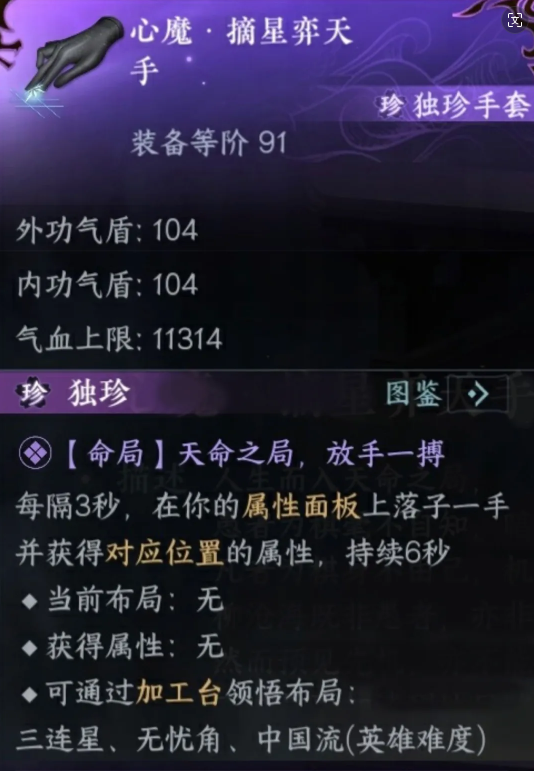 强力装备 【心魔·摘星弈天手】:击败恶弈心魔概率掉落 各位同门请注意,【摘星弈天手】可与探索获得的围棋棋谱加工,得到【摘星弈天手·三连星】与【摘星弈天手·无忧角】这两款升级后的装备,诸位可选择更适合自己的装备升级佩戴。 【混沌之牙】:击败混沌概率掉落 【混沌之牙】为独珍加工道具,可与永夜星都世界首领混沌掉落的【混沌浊息链】加工得到更多强力的【混元噬空链】。小提示,【混沌浊息链】和【混元噬空链】吞噬紫色以上品质装备(非独珍)可以提升其攻击力,大家一定要记得喂养该项链哦。 【柳沧海·永夜】:击败柳沧海率掉落 宝藏获取攻略:洞悉无遗,通关无虞 然而,宝藏并不是这么容易就可以得到的。与幻域中脾气相对温和的首领截然不同,神域中的首领们都有着强大的实力和独特的技能。 除了柳沧海一念之间产生的【恶弈心魔】、先天之气所化的凶兽【混沌】,镜天阁阁主【柳沧海】也终将在神域之中揭开神秘面纱。诸位只有击败他们,才能破除盘踞在永夜星都之上的层层迷雾,寻找到最终的宝藏。