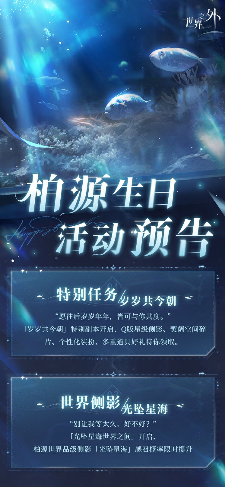 #世界之外#丨✦柏源生日活动预告✦ 4月10日起,柏源生日系列活动开启 💕 特别任务 · 岁岁共今朝 「岁岁共今朝」特别副本即将开启,Q版星级侧影、契阔空间碎片、个性化装扮、多重道具好礼待你领取。 💕世界侧影 · 光坠星海 「光坠星海世界之间」开启,柏源世界品级侧影「光坠星海」感召概率限时提升。 💕心动企划/最好的礼物 生日主题心动企划即将公开,跨越迷雾,向你奔赴 💕还有生日主题表情包、周边预售、线下打卡点等主题内容即将解锁,更多活动情报,请持续关注官方动态。 “世界无限,此爱不变” ——··——··—— 👉点我一键开启云玩👈[cloudgaming://startgame?game_code=sjzw] 👉点我前往抽取648R游戏基金👈[https://cloudgame.webapp.163.com/pt/?id=650959321fc75bbbb837628d]