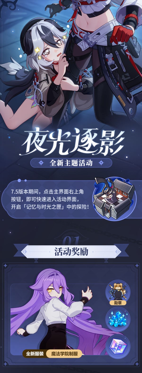 #崩坏3#在遥远的过去,人们总会点亮灯火,驱散黑夜中的恐惧。 舰长好,7.5版本将开启「夜光逐影」主题活动。参与活动可获得奇迹☆魔法少女全新服装「魔法学院制服」、「欺世棋局勋章」、水晶、根源棱镜等奖励。 更多详细内容请查看下方图片~