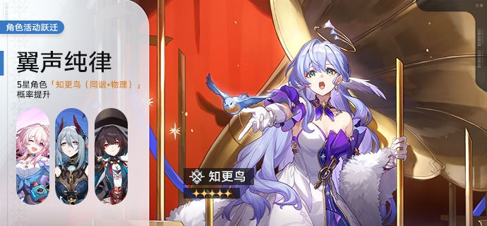 角色活动跃迁:「翼声纯律」、「落日条款」 亲爱的开拓者: 本期角色活动跃迁时间为 2024/05/08 2.2版本更新后 - 2024/05/29 11:59,包含如下内容: ▌「翼声纯律」角色活动跃迁 ● 活动期间,限定5星角色「知更鸟(同谐•物理)」,4星角色「三月七(存护•冰)」「寒鸦(同谐•物理)」「雪衣(毁灭•量子)」跃迁成功概率限时提升。 ▌「落日条款」角色活动跃迁 ● 活动期间,限定5星角色「托帕&账账(巡猎•火)」,4星角色「三月七(存护•冰)」「寒鸦(同谐•物理)」「雪衣(毁灭•量子)」跃迁成功概率限时提升。 ※以上角色中,限定角色不会加入「群星跃迁」。 ※活动期间,限定5星角色「知更鸟(同谐•物理)」仅可在「翼声纯律」角色活动跃迁中获取,限定5星角色「托帕&账账(巡猎•火)」仅可在「落日条款」角色活动跃迁中获取。 ※以上跃迁属于「角色活动跃迁」,跃迁次数保底完全共享。在任意「角色活动跃迁」中未获取5星角色的累计跃迁次数会一直共同累计在「角色活动跃迁」中,与其他跃迁的跃迁次数保底相互独立计算,互不影响。 ※详细信息可前往跃迁系统查看。 ▌材料关卡限时提前开启 ● 活动时间:2024/05/08 2.2版本更新后 - 2024/06/05 11:59 ● 活动说明:活动期间,「知更鸟(同谐•物理)」「托帕&账账(巡猎•火)」晋阶材料与行迹材料的关卡将限时提前开放。若开拓者并未解锁对应关卡,可通过「星际和平指南-生存索引」直接挑战。 ● 本期开放: 凝滞虚影:职司之形、燔灼之形 拟造花萼(赤):同谐之蕾•「白日梦」酒店-梦境、巡猎之蕾•城郊雪原 ▌「锋芒崭露」角色试用活动 ● 参与条件:开启「旅情事记」 ● 活动时间:2024/05/08 2.2版本更新后 - 2024/05/29 11:59 ● 活动内容:可试用角色「知更鸟(同谐•物理)」「托帕&账账(巡猎•火)」「三月七(存护•冰)」「寒鸦(同谐•物理)」「雪衣(毁灭•量子)」体验关卡,达成挑战后,可获得星琼、冒险记录、通用培养材料、信用点奖励。