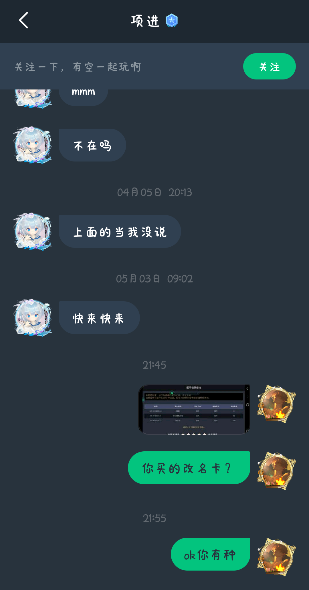 避雷贴,原名㝏,现在叫项进,在我房间用了180蛋币买了改名卡,现在背包里没有改名卡,蛋仔id也没有改掉,改名卡蒸发了,估计是赠送出去了,但没找到赠送记录,做的还挺干净,原本我还不确定是不是㝏,我就问了一下,连回都不回,直接取关了我,OK,我也是明白了,来我房间那么多次,还跟你是互关,呵呵,你也就值那18块钱了
