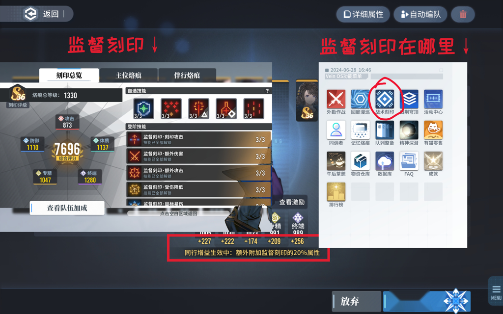 这张图展示了监督刻印的属性和技能,重要的是要记住选择监督刻印会占用队伍中的一个位置。原本的8人队伍现在只能上七位同调者。
