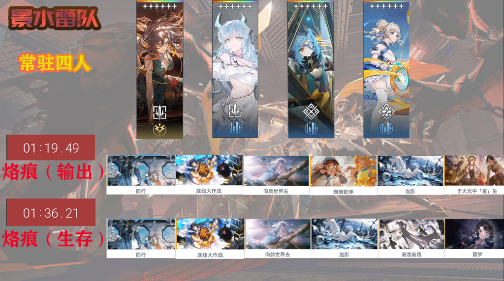 数据支持:队伍的符文分为两套,输出符文在漫巡回忆七叶中的使用时间为1分49秒,生存符文在漫巡回忆七叶中的使用时间为1分36秒,考虑到两套符文的攻击略有误差,因此在1分20秒的战斗中,输出符文比生存符文快约14~15秒。输出套的优点是高打伤快,但需要注意站位避免被集火,激励叠的较慢;可以先上芙蕖叠四层激励后再换上龙晴。