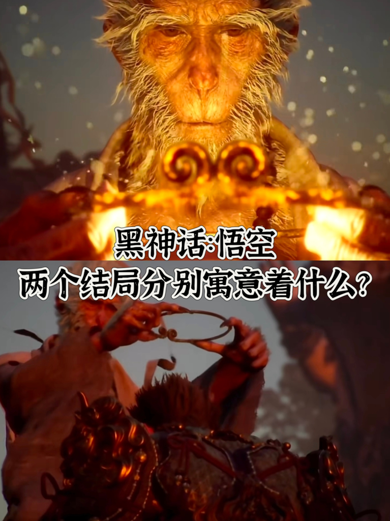 第一个结局名为“72难万象归真”。在这个结局中,天命人对抗大圣的残魂,最终老猴子将金箍套在天命人的头上。这一举动似乎是希望天命人能重新经历孙悟空的过去。金箍的存在主要是为了控制孙悟空,以确保他能保持内心的清净。