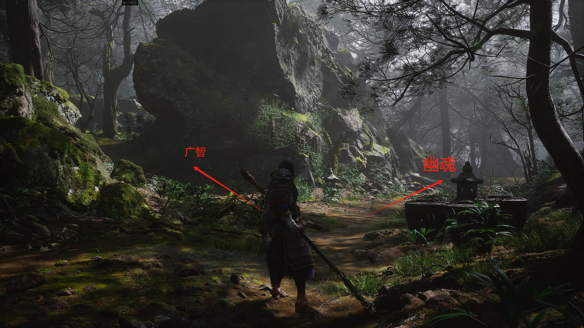 #黑神话:悟空# 幽魂攻略 1.我们可以先去打广智,图一是路线。广智在左边,一直走见到一个大门,门后就是广智,图三所示 2.打完广智我们有一个奇技,相当于两条命会简单很多,变身为广智,效果如图二 3.棍法我们可以选择立棍,立棍可以规避幽魂地面伤害