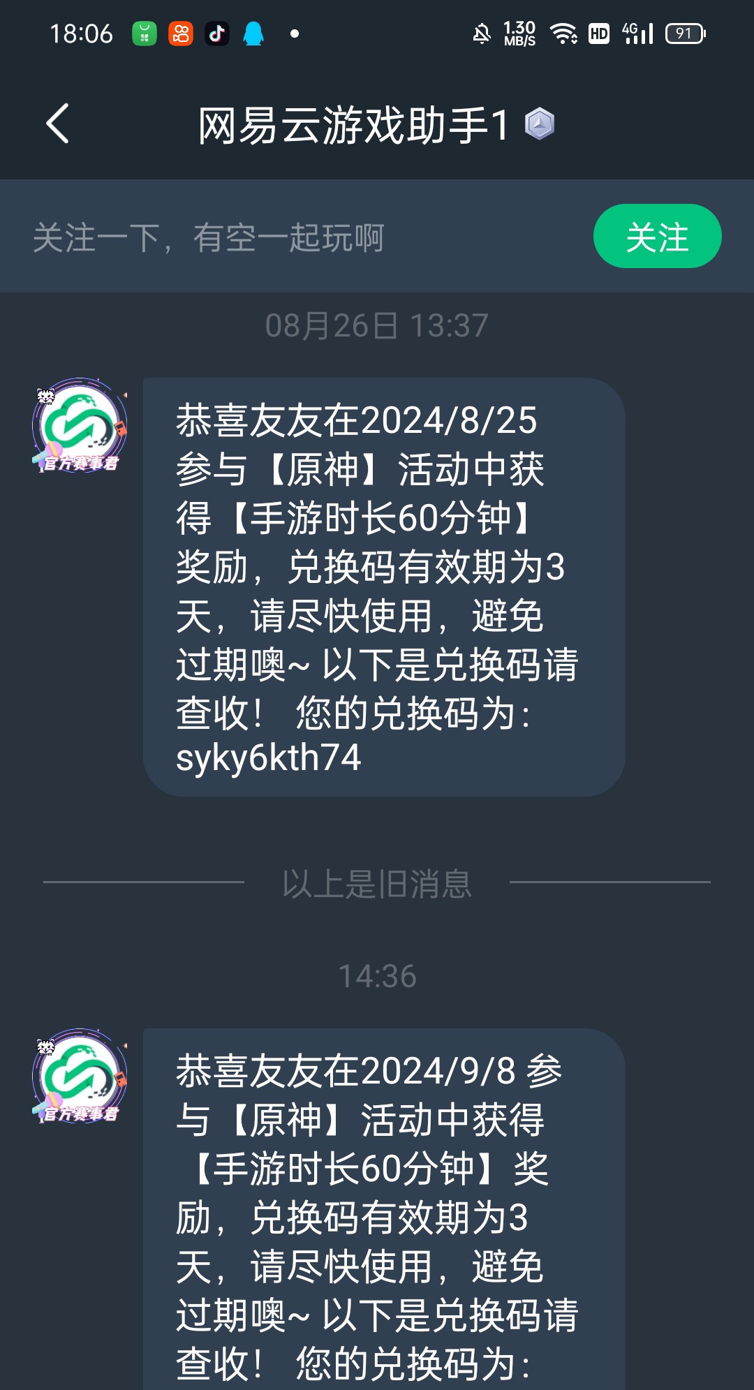 hello 各位友友早上好中午好下午好晚上好凌晨好 现在随机抽取一位友友送出60分钟手游时长兑换码 ios的友友提前说明 名字有特殊符号的我打不出来 见谅 抽取方式:点赞抽 开奖时间:9.10下午6点半